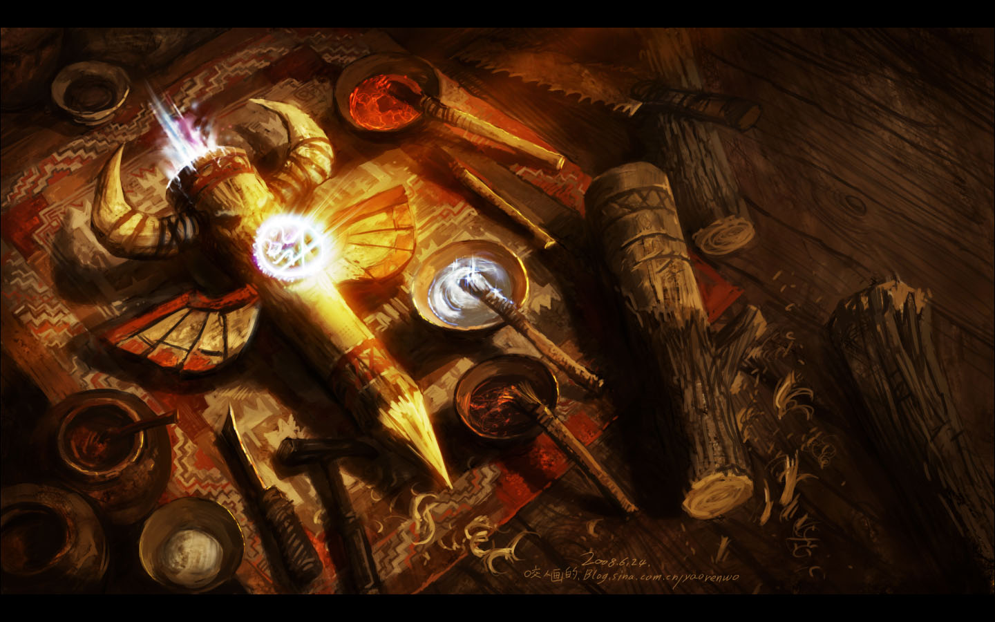 Description: A painting of a table with a bunch of tools on it and a flashlight in the middle of the table.