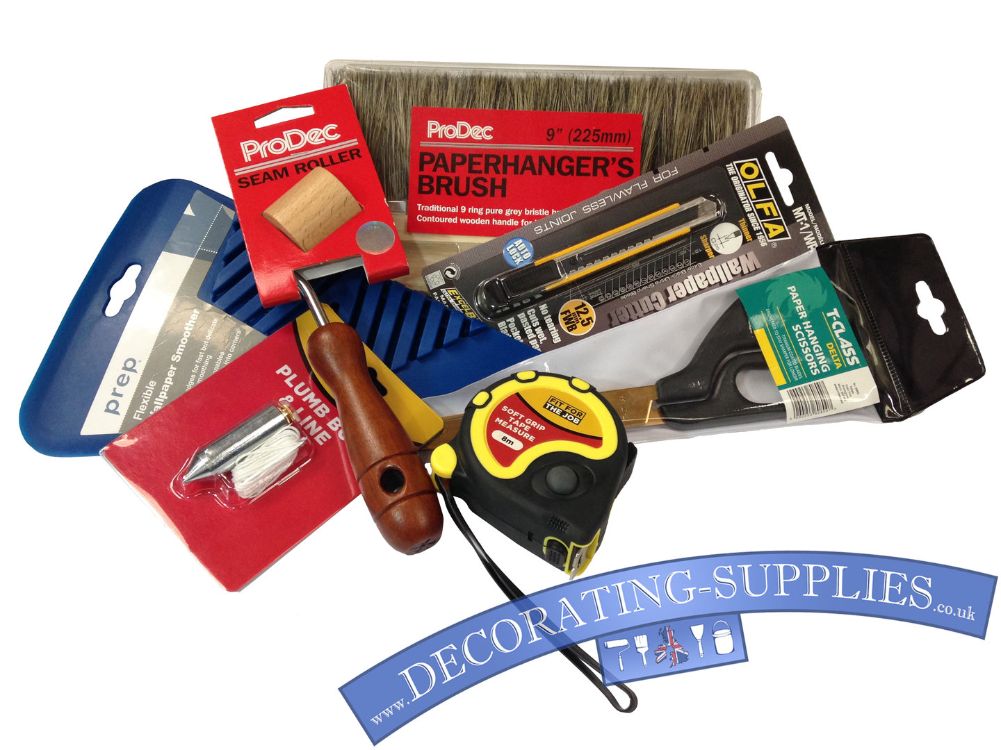 Description: A pile of tools and supplies sitting on top of a table next to a blue ribbon with a blue ribbon.