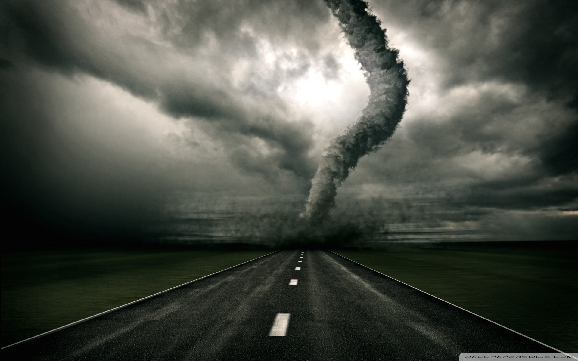 Description: A tornado cloud is coming down the road in the middle of the night sky with a long straight road leading to it.