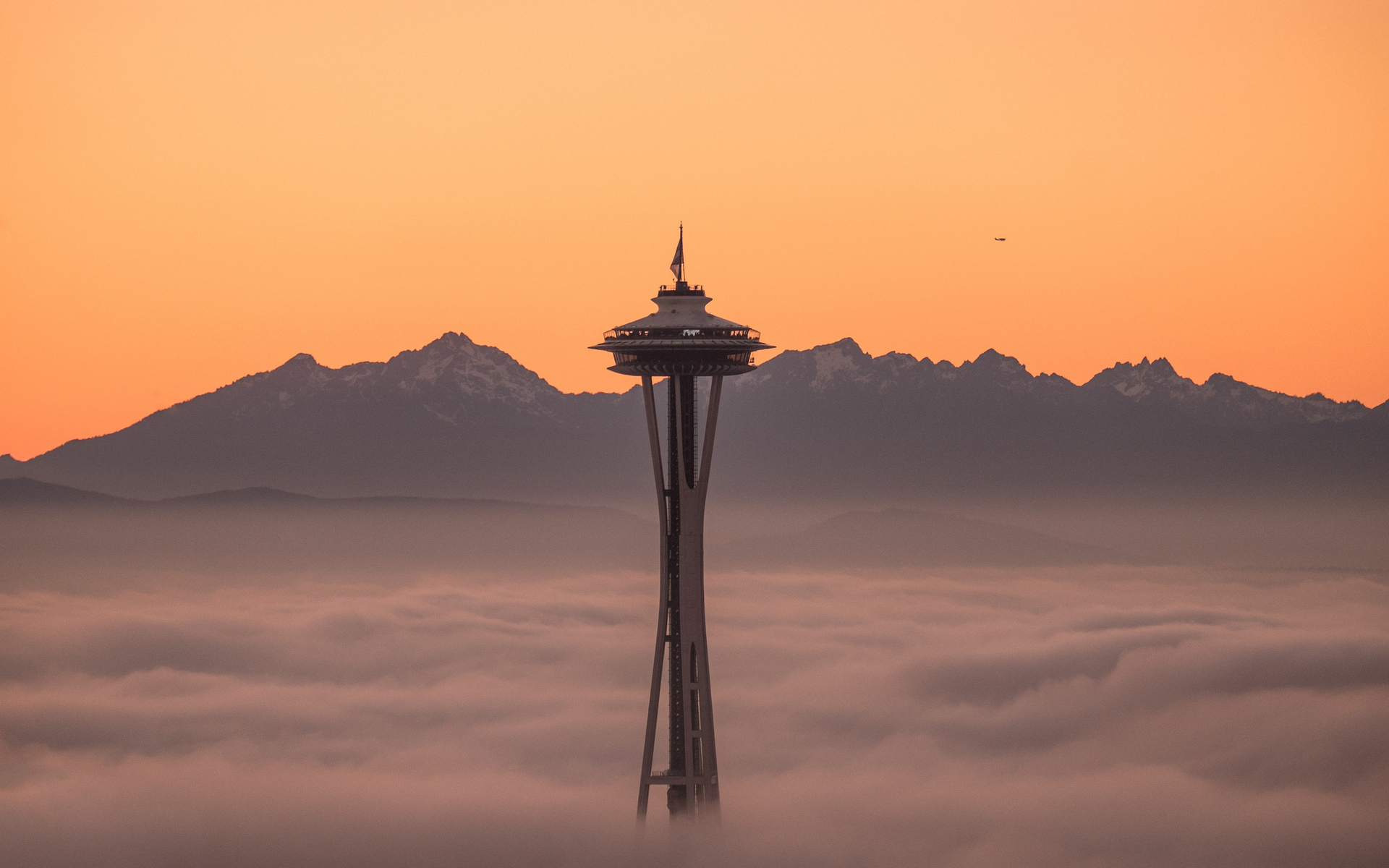 Description: A tower in the middle of a foggy sky with a sunset in the background and a bird flying over the top.