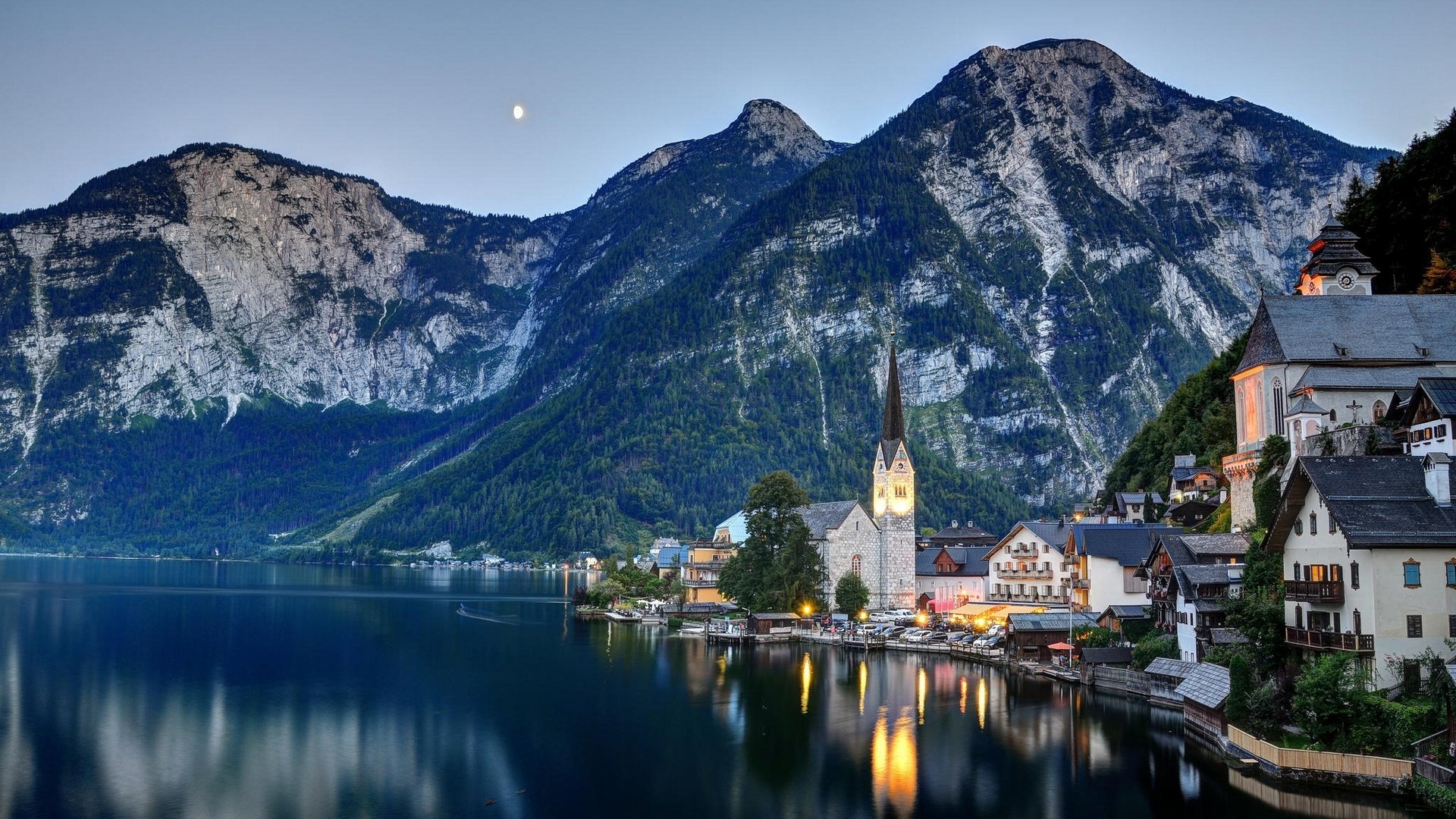 Description: A town on a lake with mountains in the background at dusk with a full moon in the sky above.
