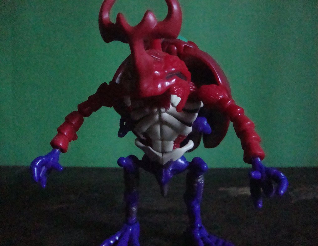 Description: A toy figure with a red and white body and purple legs and arms and feet.