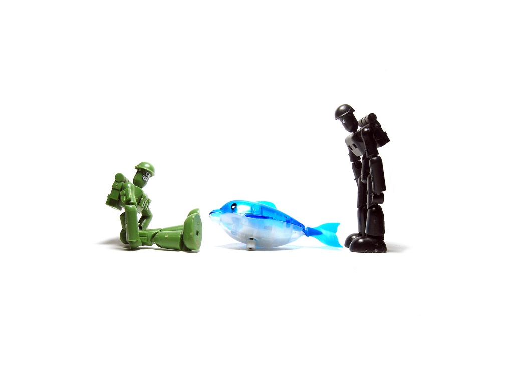 Description: A toy figure and a toy fish on a white background with a toy figure standing next to it and a toy figure standing next to it.