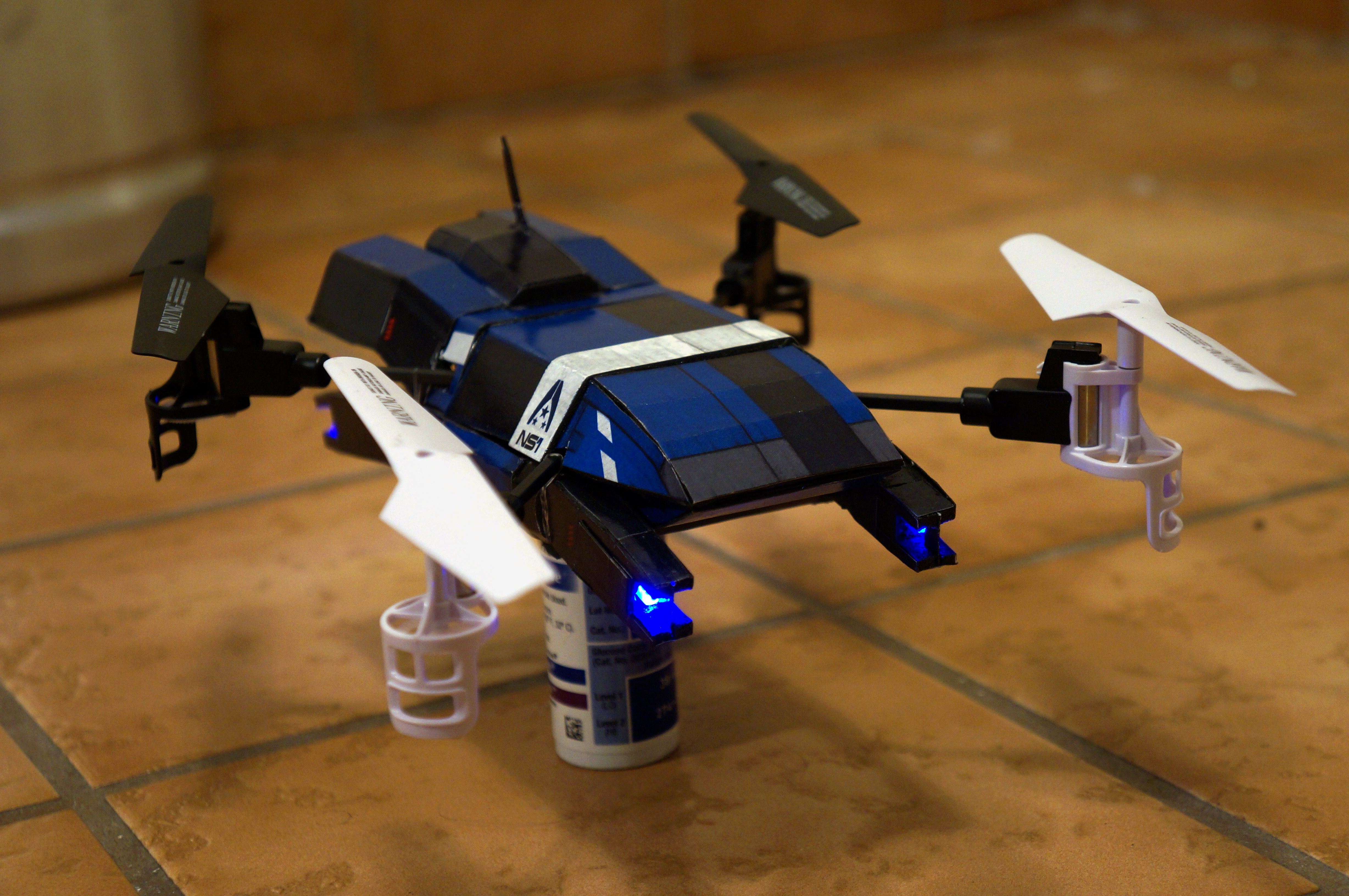 Description: A toy that is on a tile floor with a can of paint in front of it and a remote control.