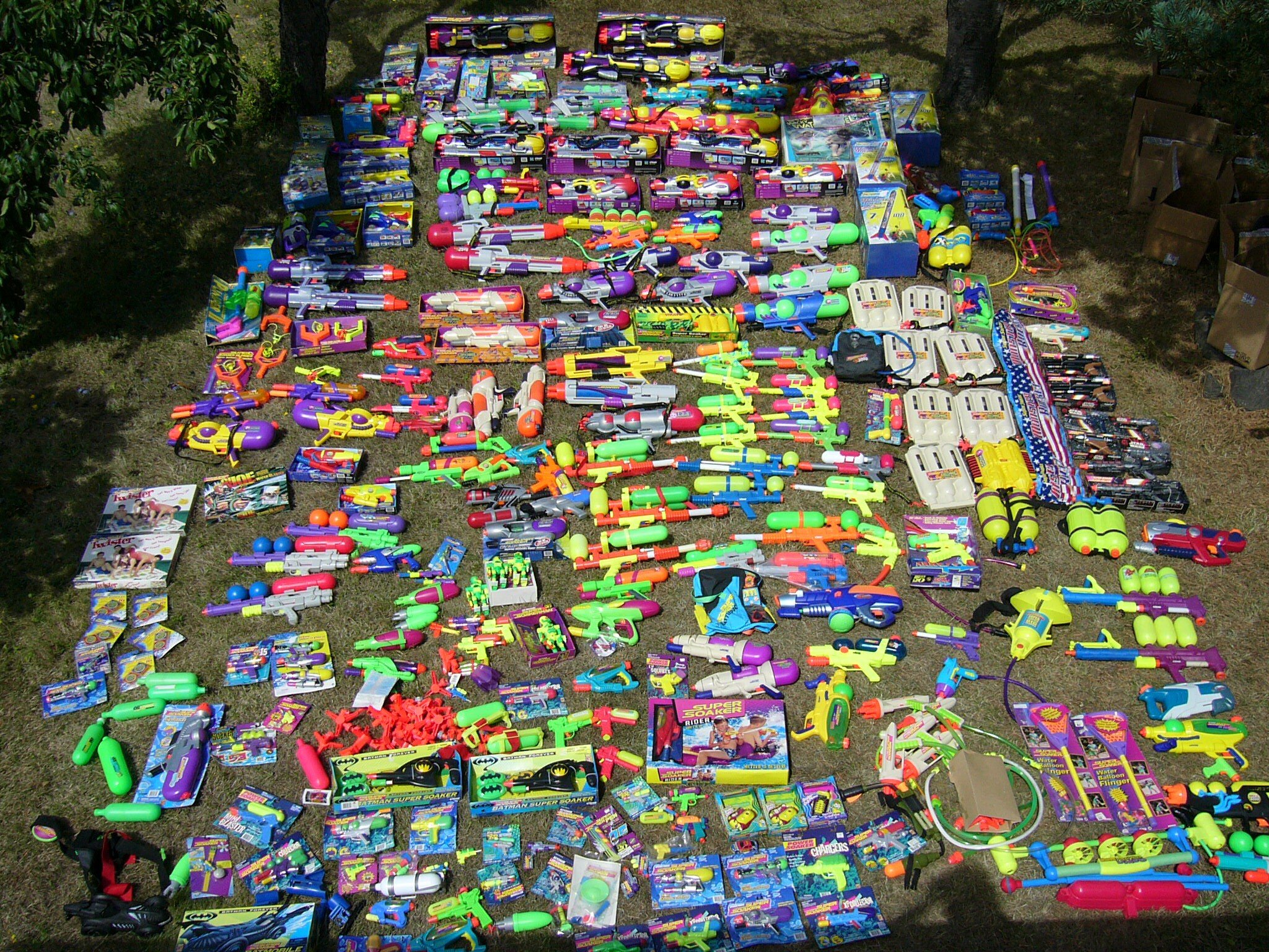 Description: A large number of toys and toys laid out on the ground in a park area with trees and grass.
