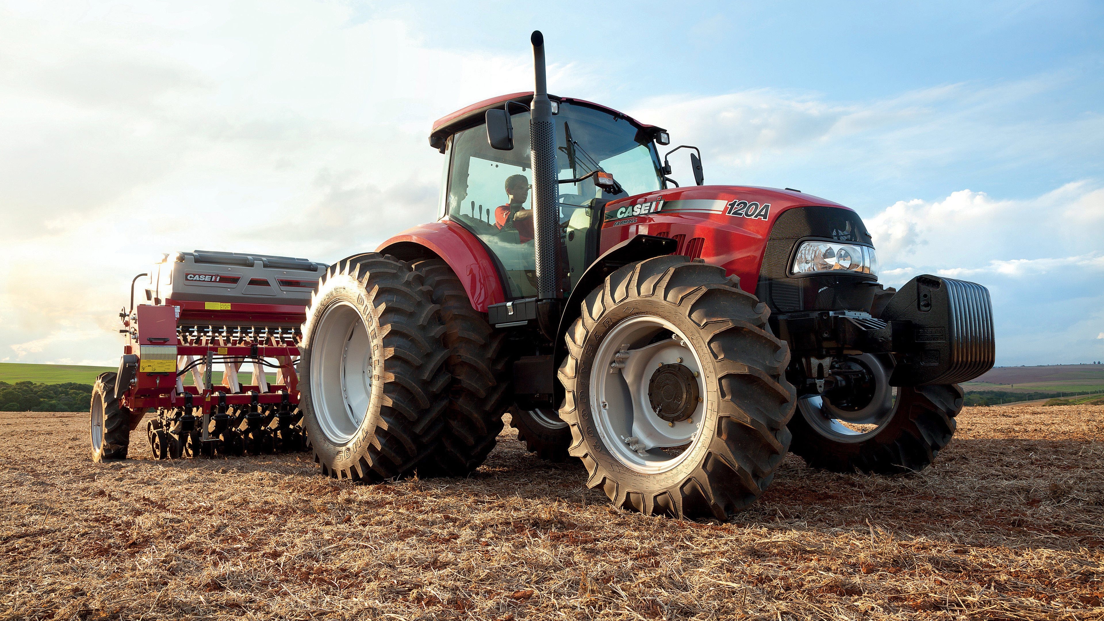 Description: A tractor is parked in a field with a sky background and clouds in the background.
