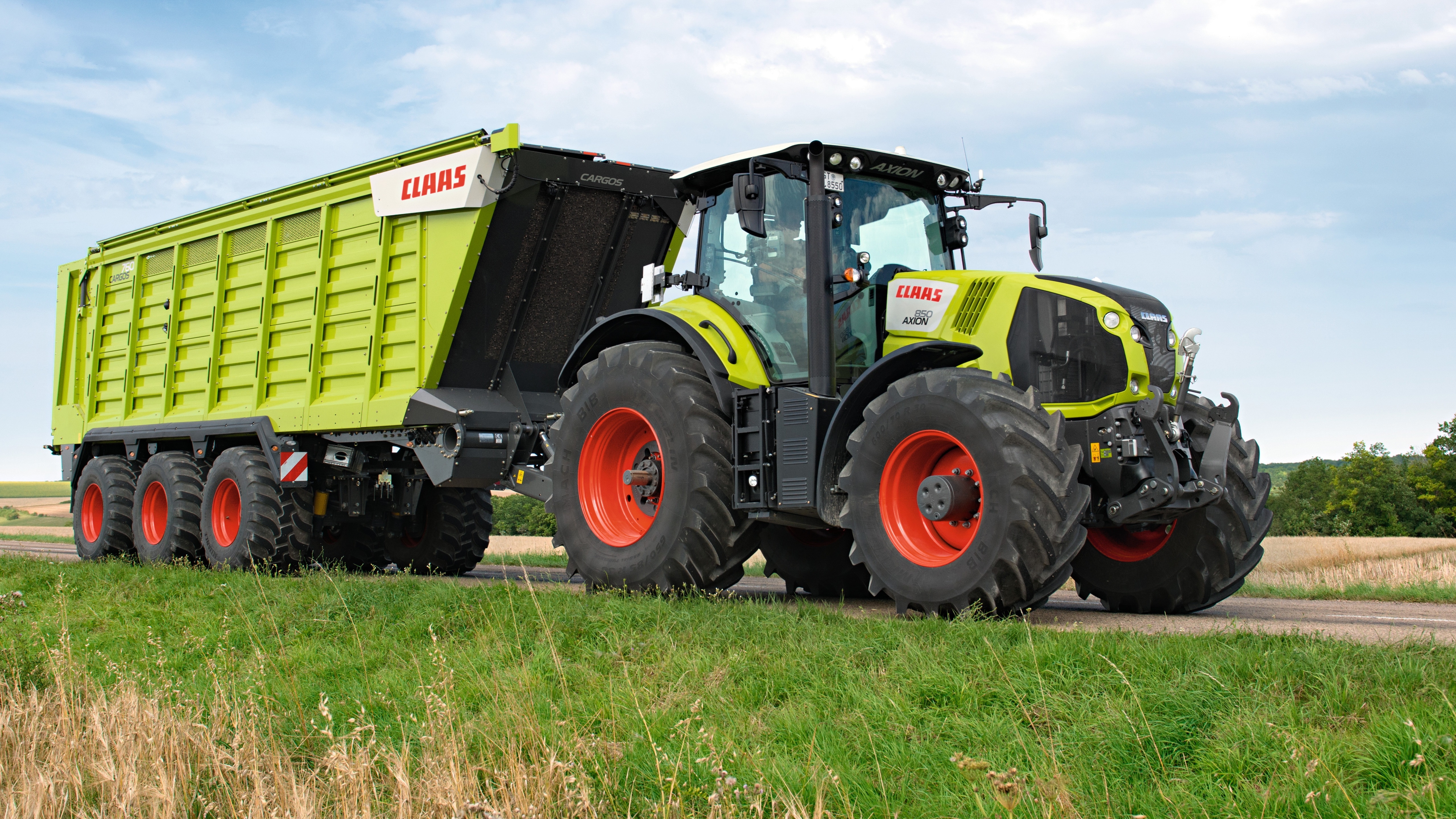 Description: A large tractor driving down a road next to a field of grass and trees on a sunny day with a blue sky.