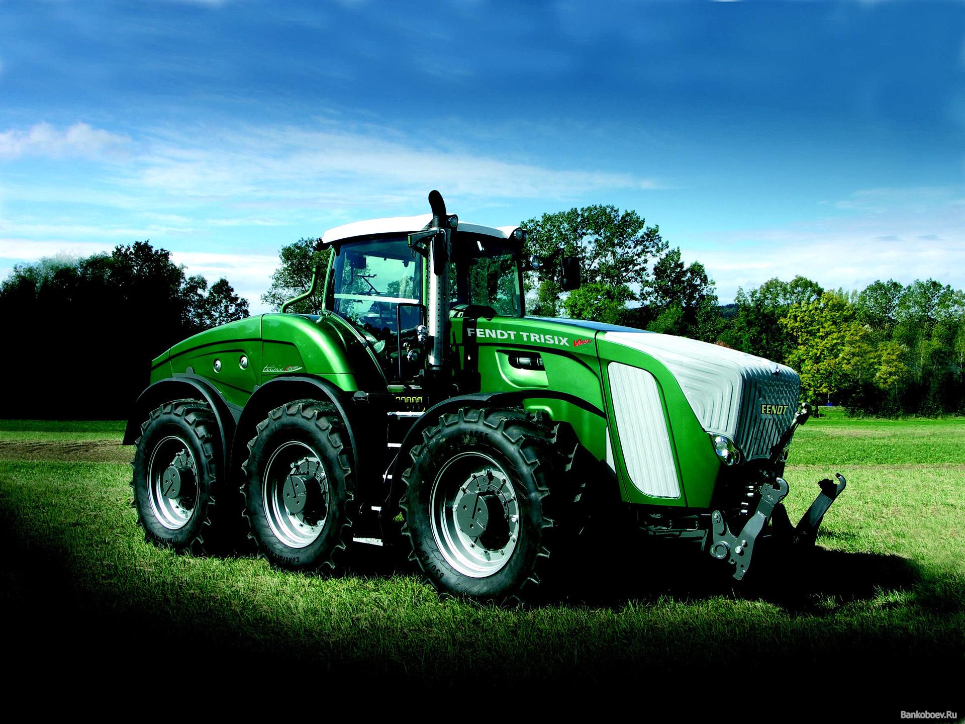 Description: A tractor parked in a field with a tarp on it's back end and a sky background.