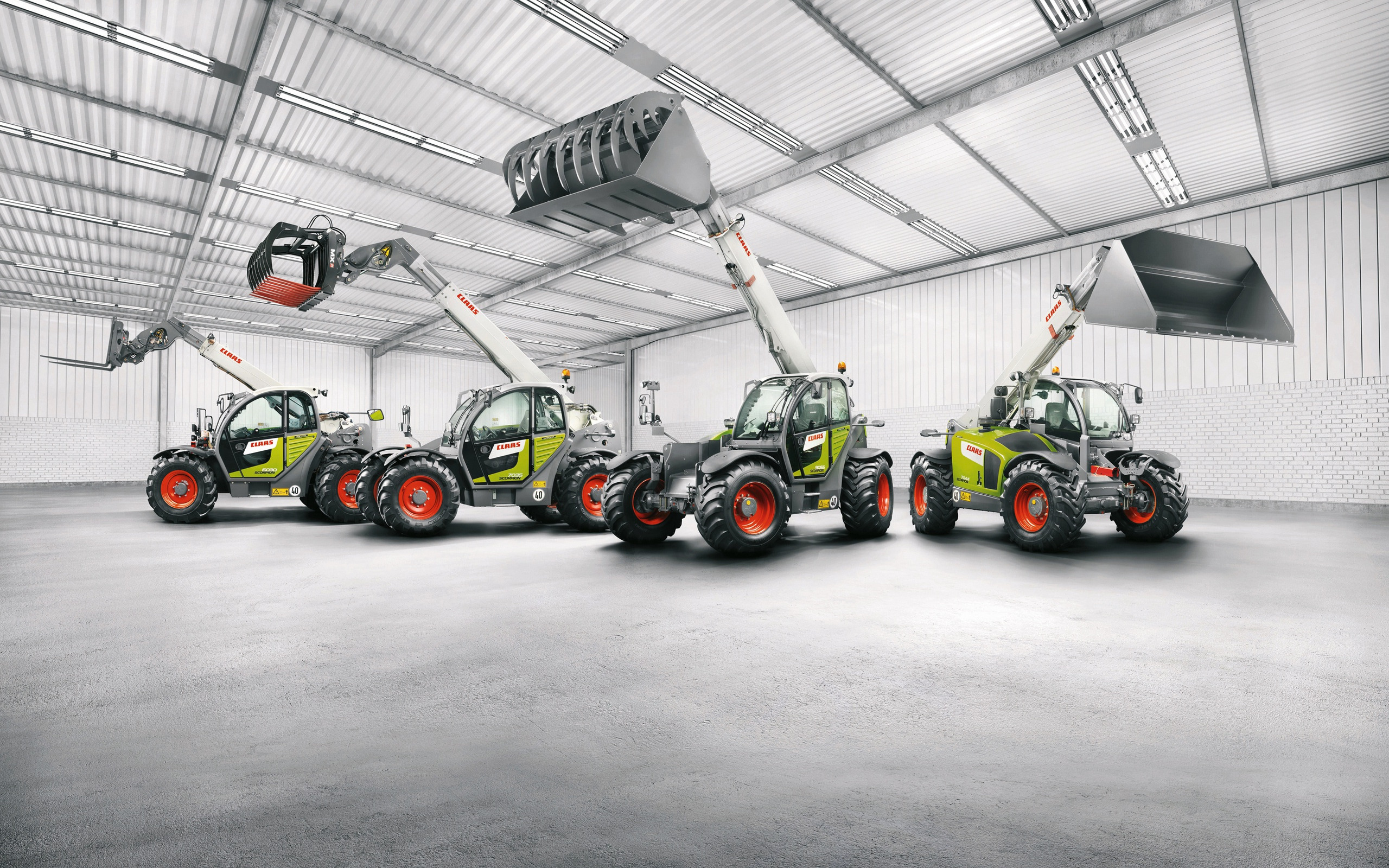 Description: A group of tractors parked in a garage with a crane on top of them and a fork on the ground.
