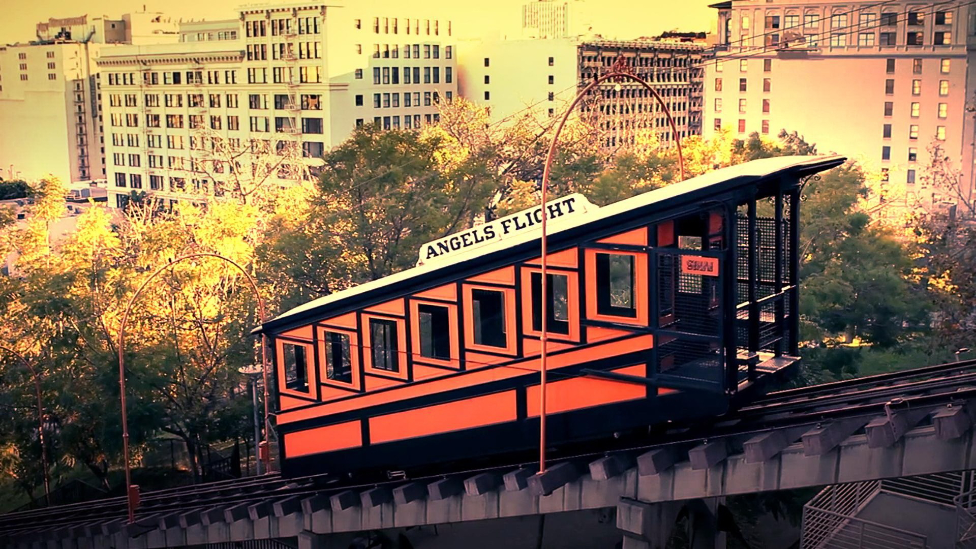 Description: A train car is on a bridge in a city with tall buildings in the background and a yellow sky.