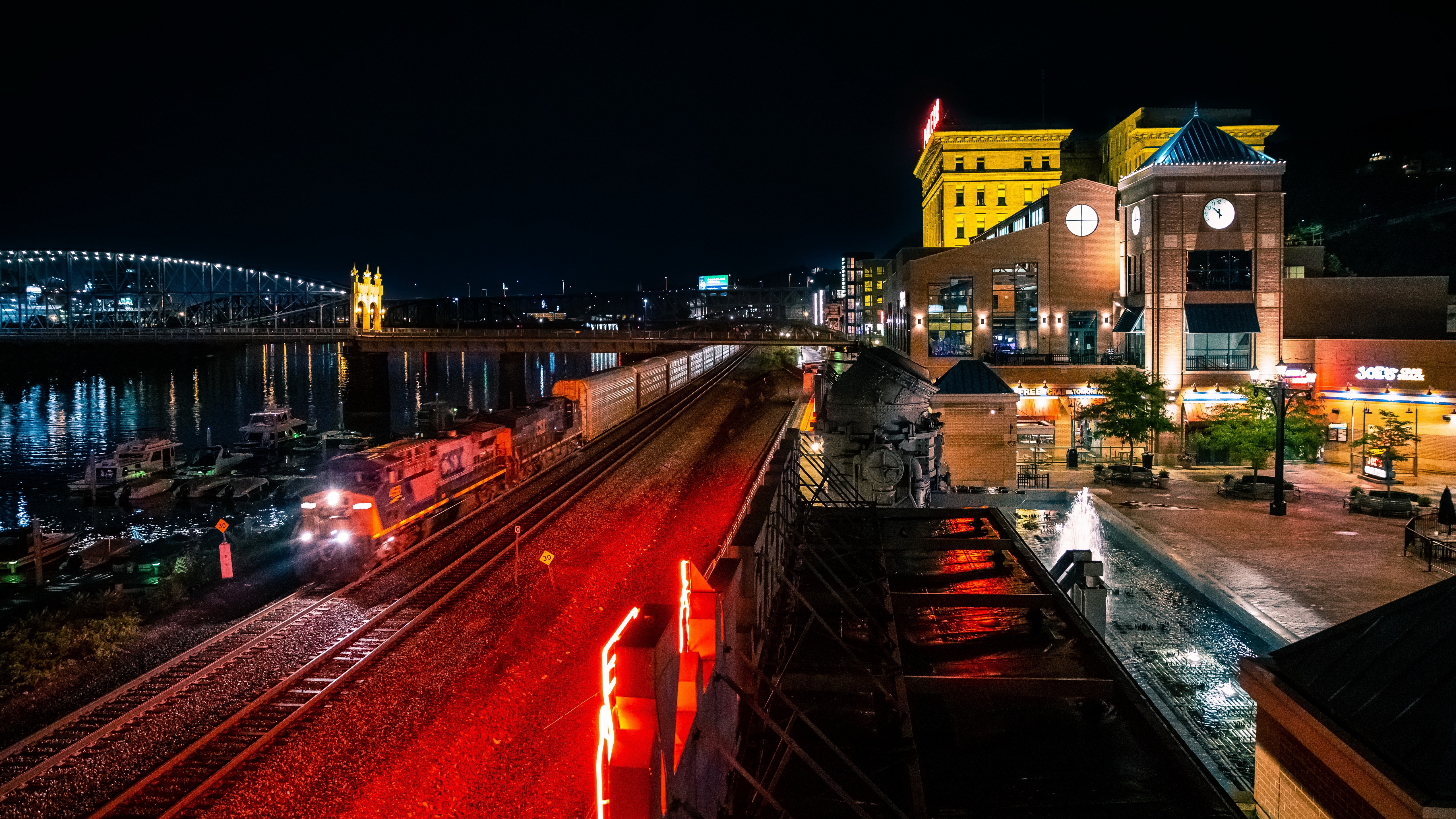 Description: A train traveling down tracks next to a city at night time with a bridge in the background and a clock tower in the distance.