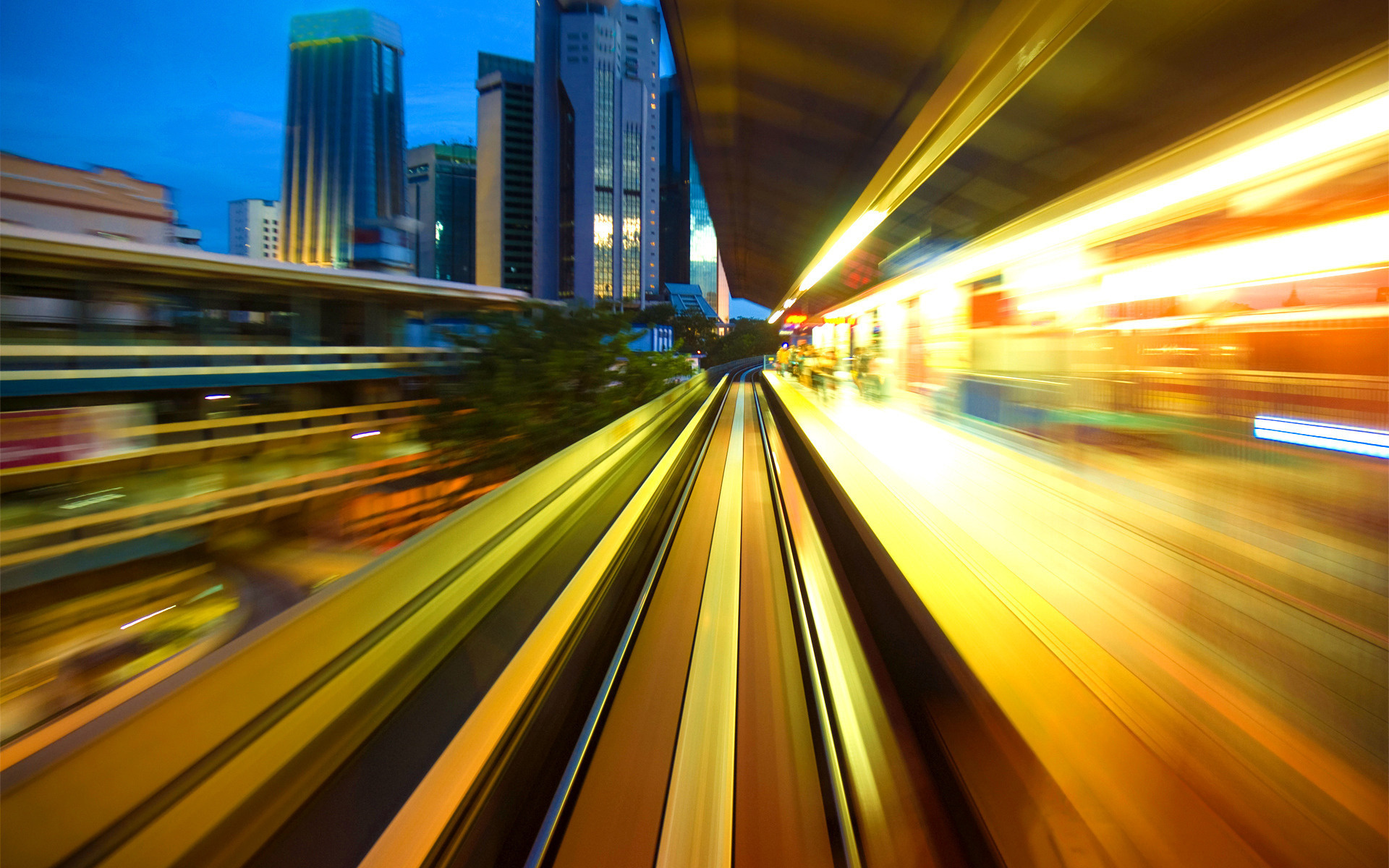 Description: A train traveling through a city at night time with buildings in the background and a blurry image of the train.