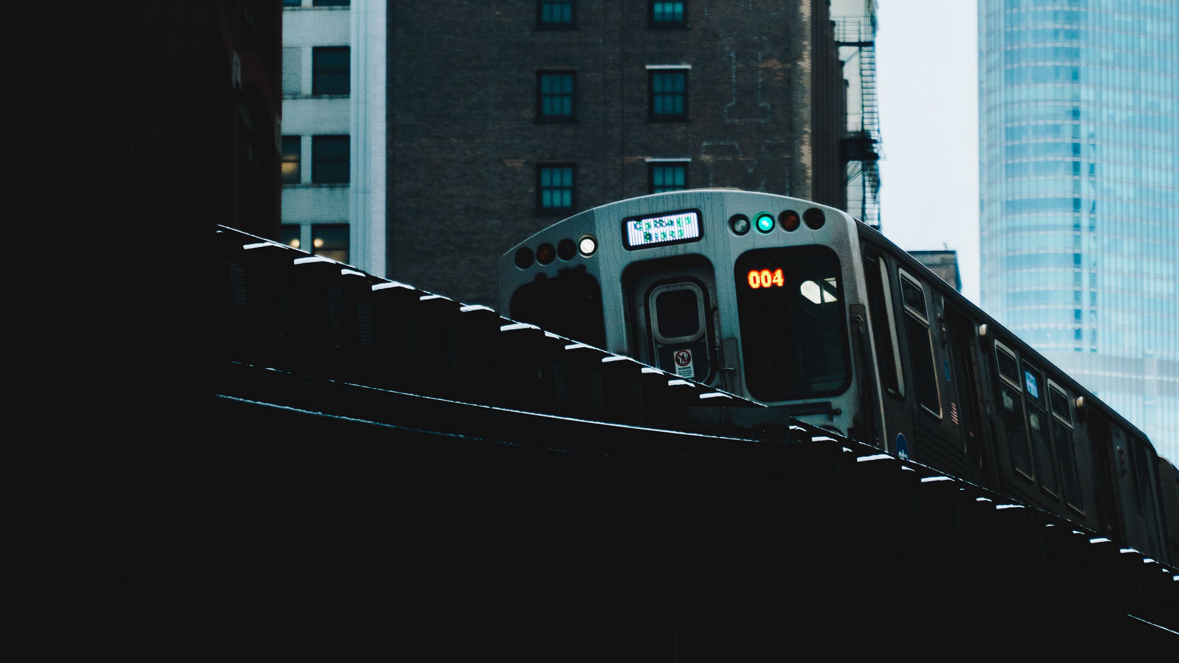 Description: A train traveling through a city next to tall buildings and a bridge with traffic lights on it's sides.