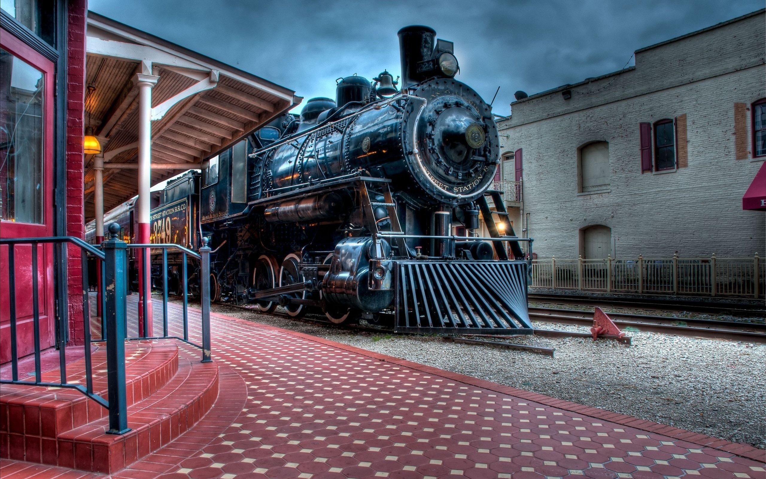 Description: A train is parked on the tracks near a building and a red staircase with a red door and a red door.