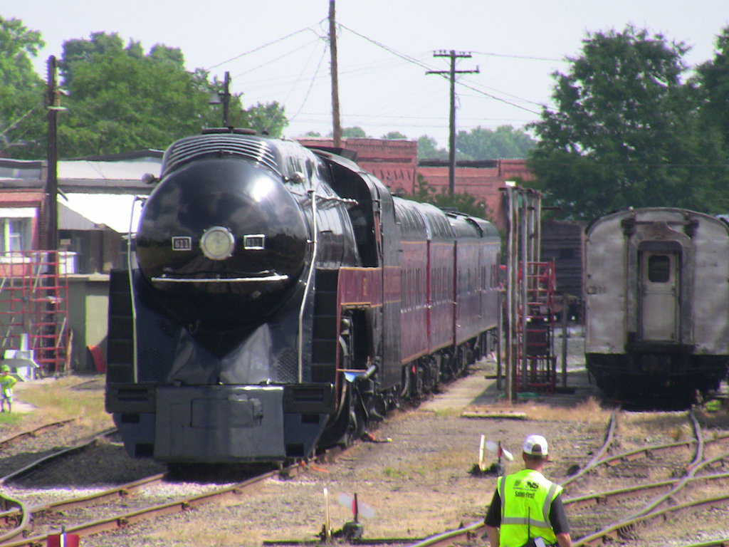 Description: A train is parked on the tracks near a man in a yellow vest and a man in a green vest.