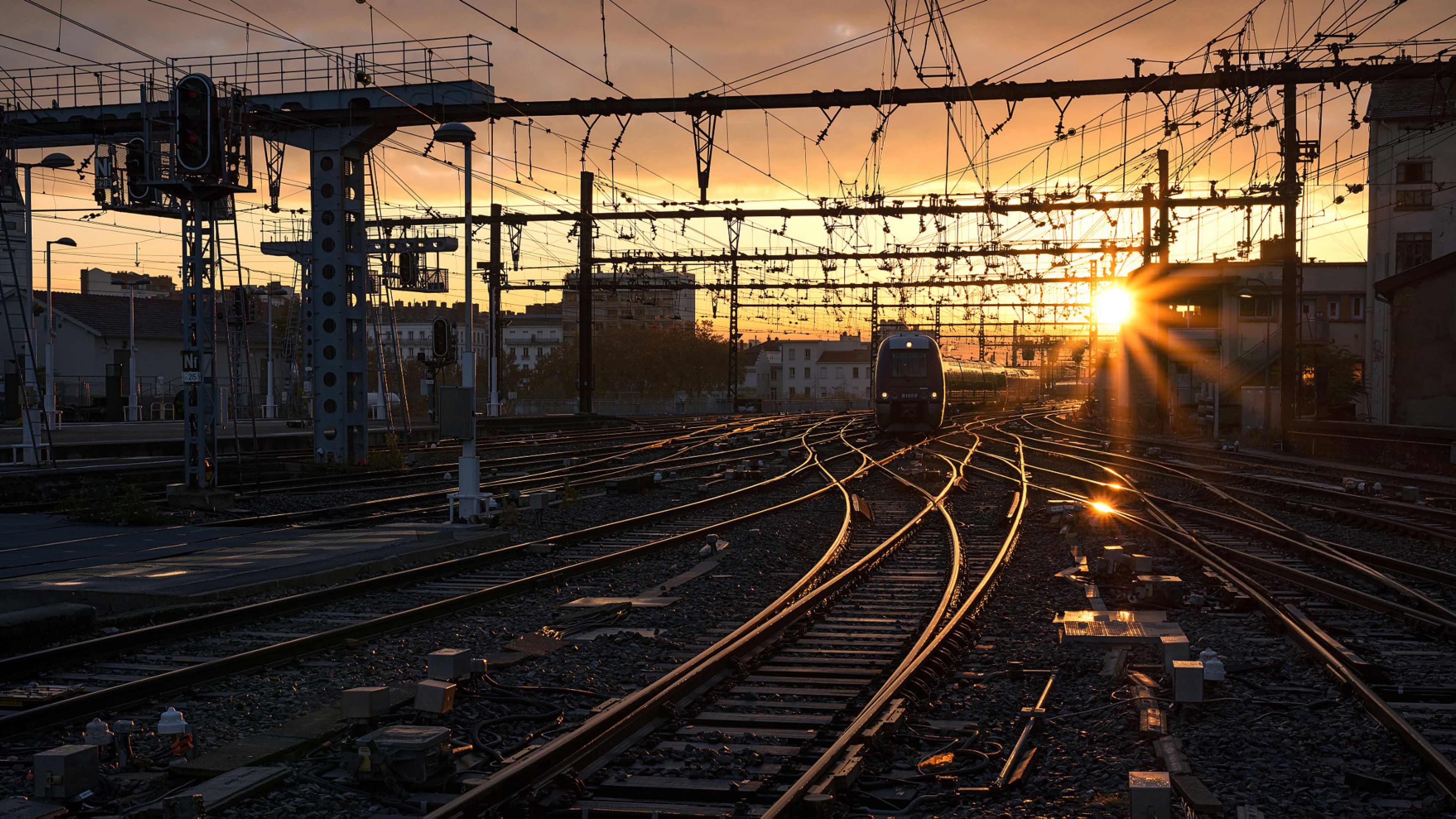 Description: A train traveling down train tracks at sunset with the sun setting in the background and buildings in the foreground.