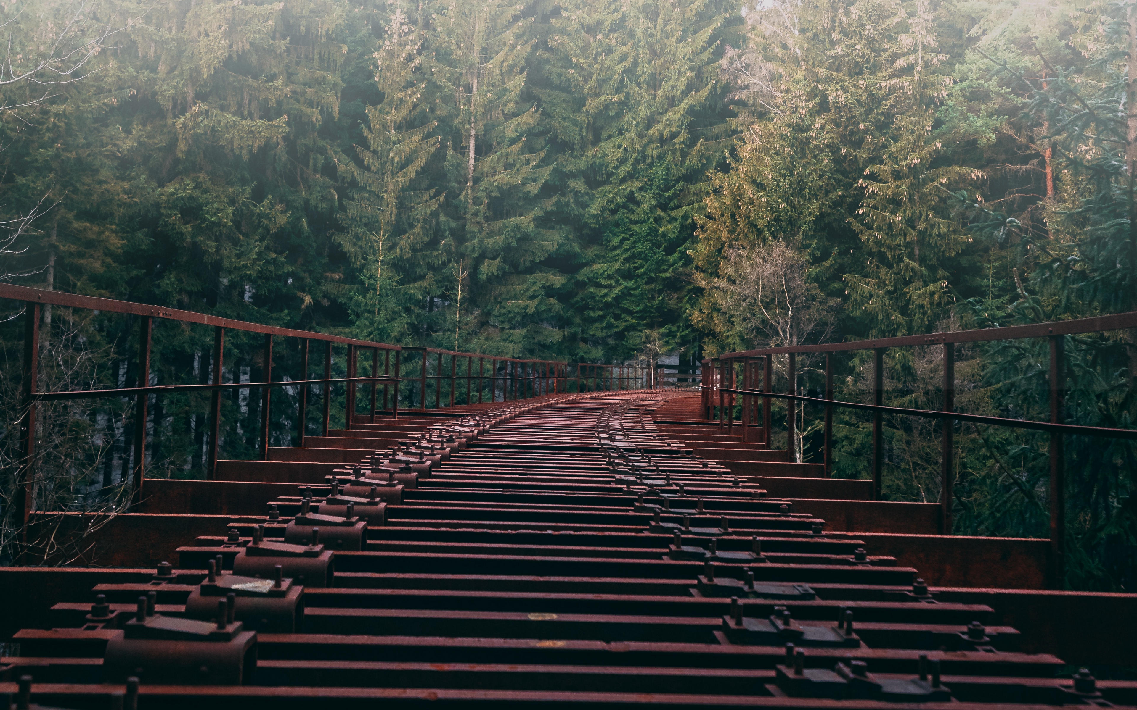Description: A train track with trees in the background and a fence in the foreground with a train crossing over it.