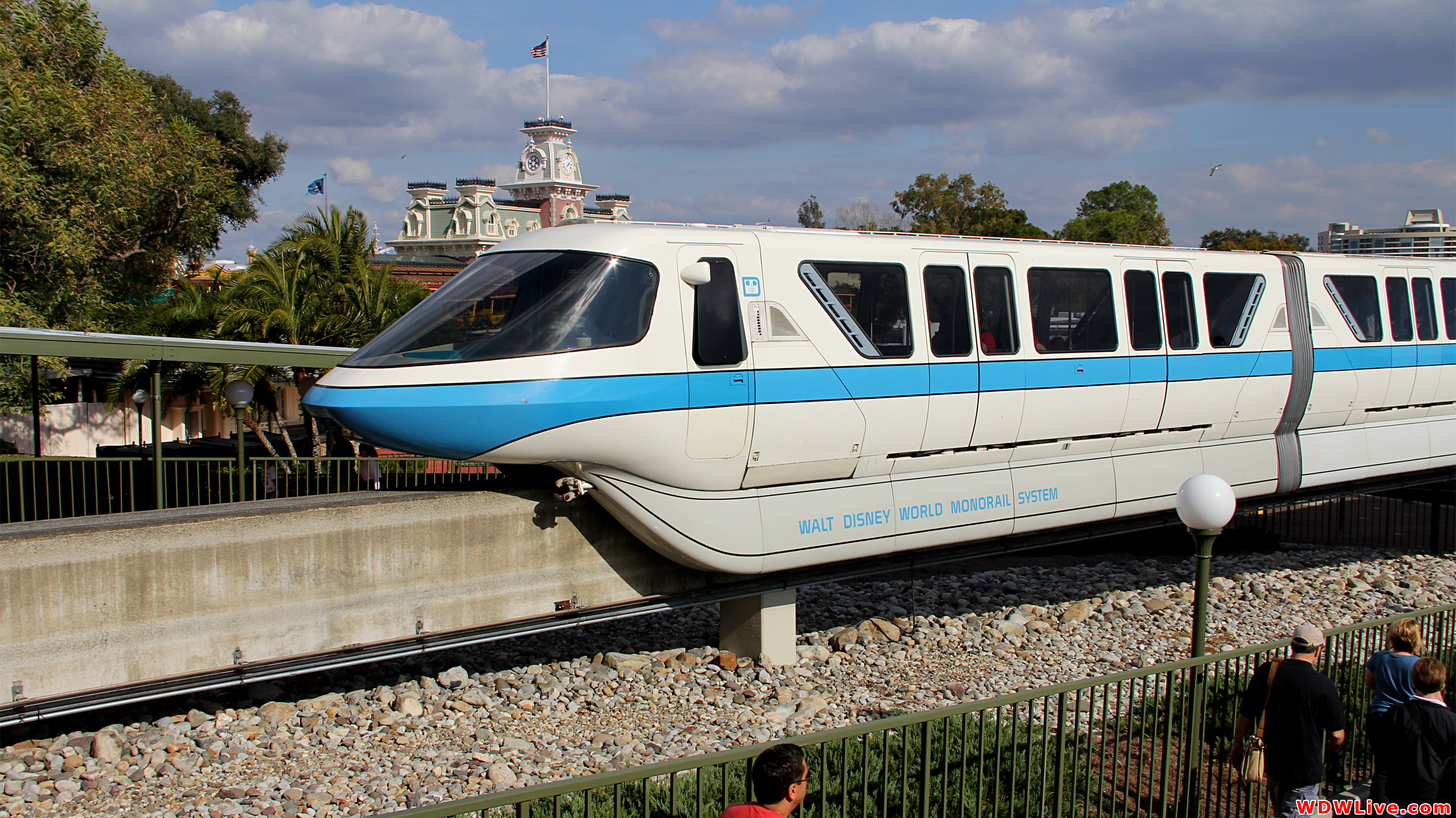 Description: A train is on the tracks near a fence and people are standing near it and looking at it from the side.