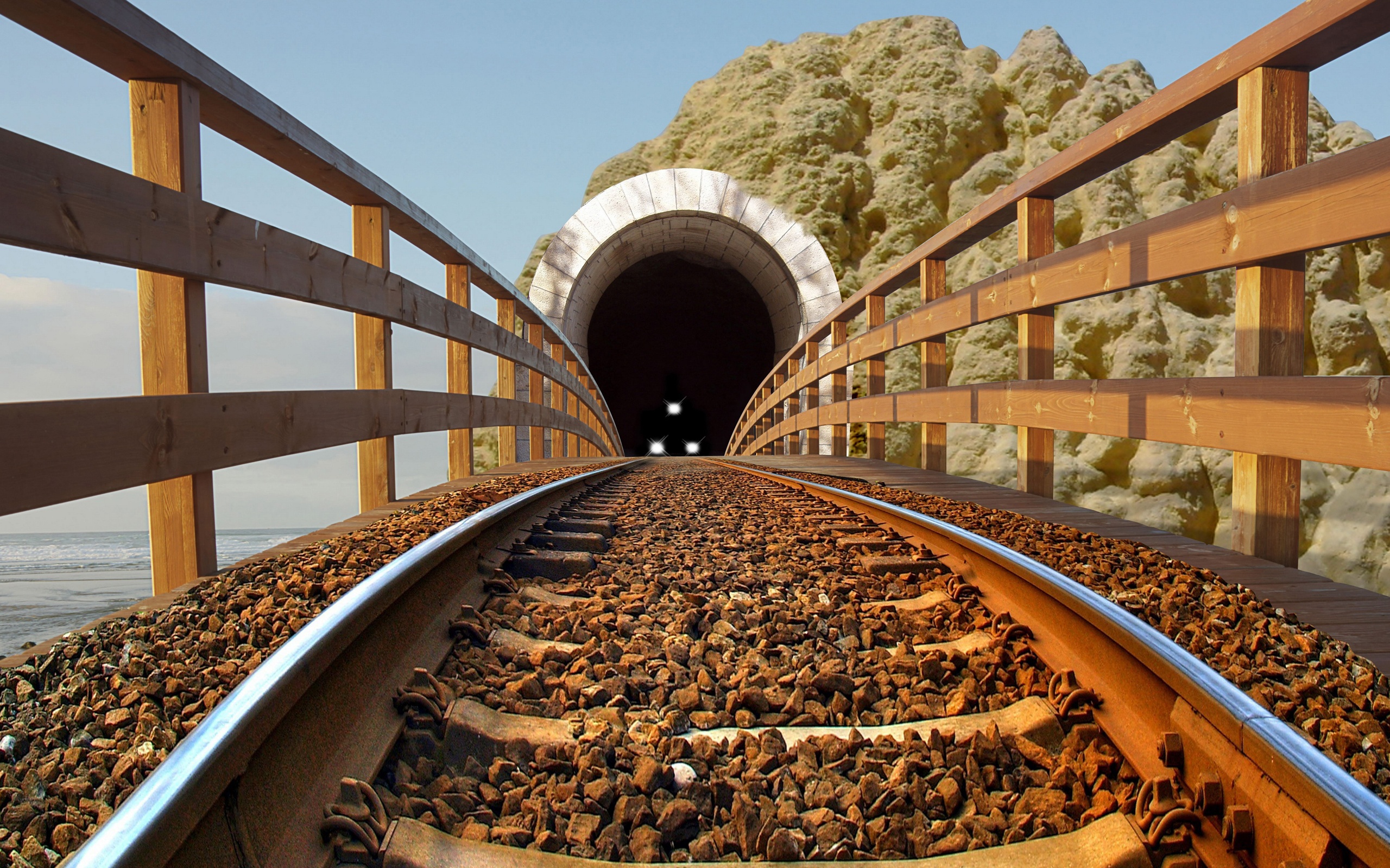 Description: A train track going into a tunnel with rocks on either side of it and a light at the end.