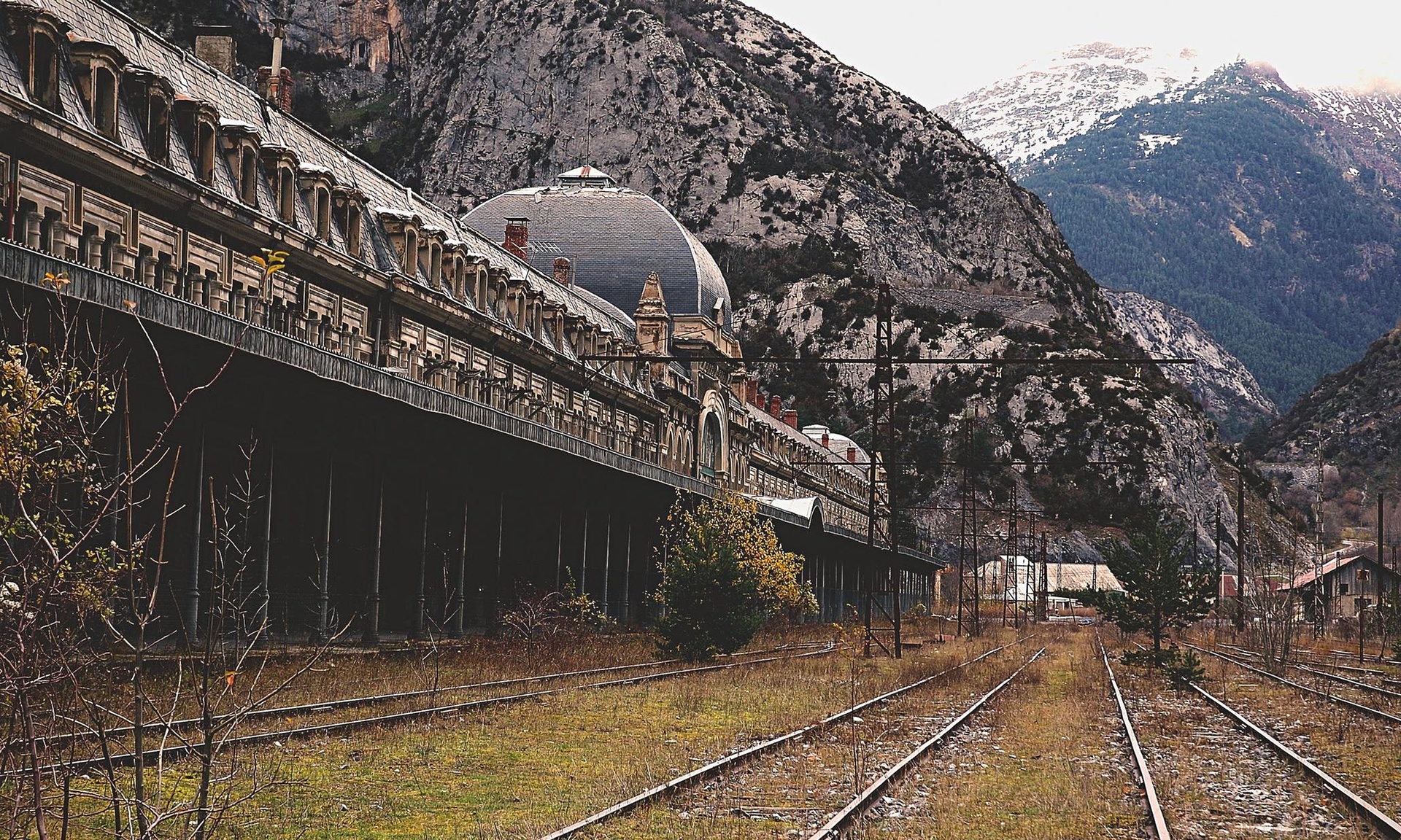 Description: A train track with a mountain in the background and a building on the side of the track with a dome on top.