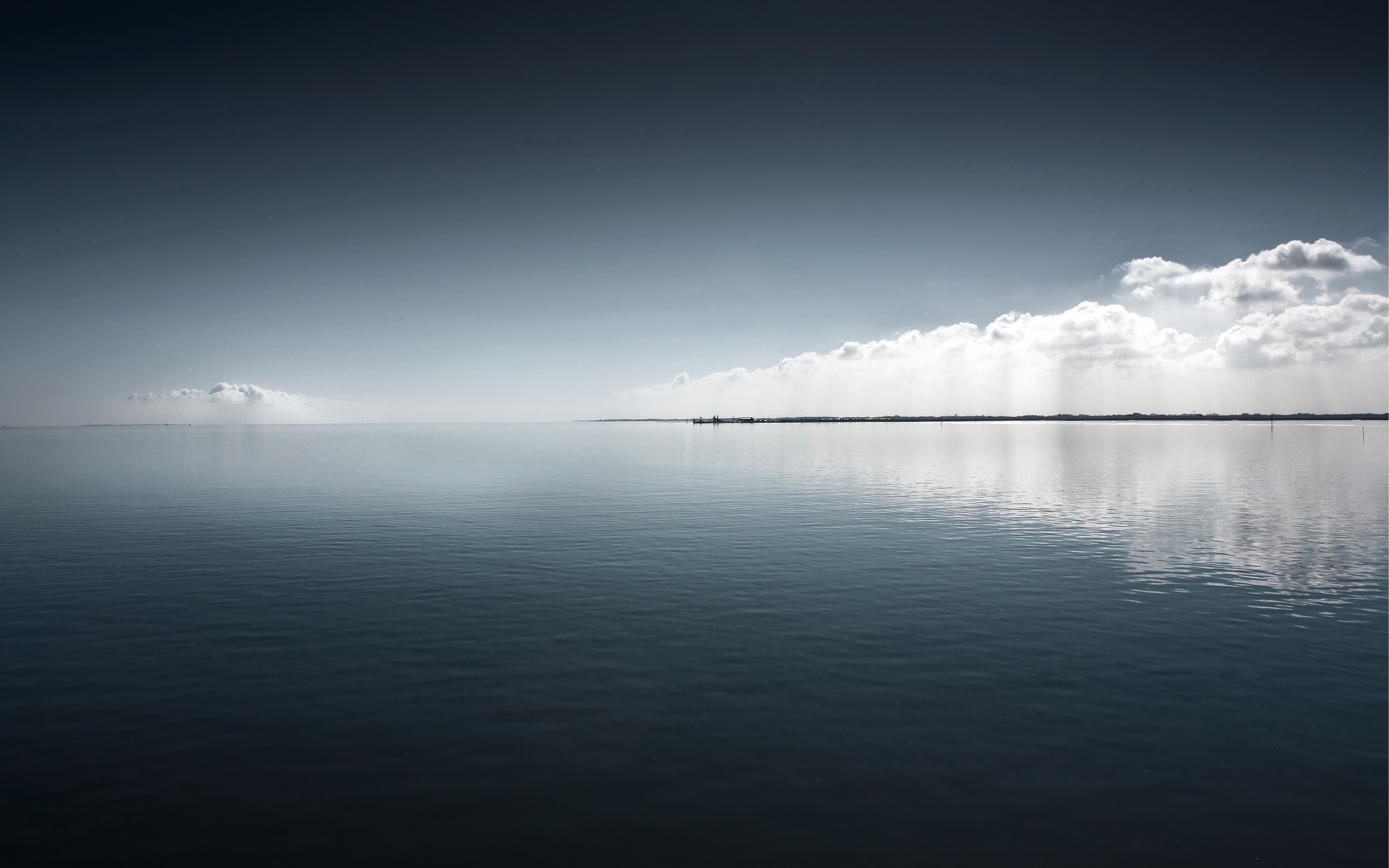 Description: A large body of water with a sky background and clouds above it and a line of trees in the distance.