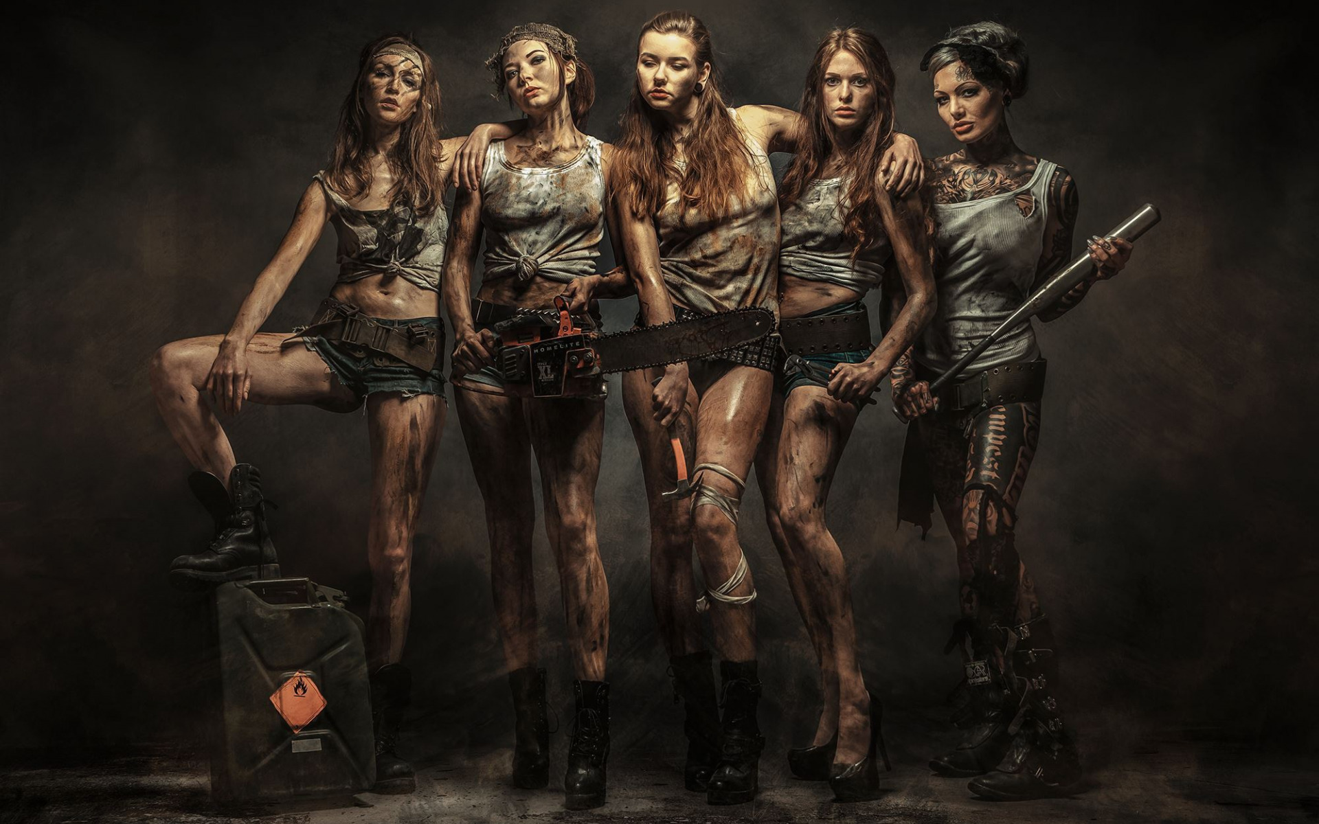 Description: A group of women in costumes holding a chainsaw and a tool in their hands.