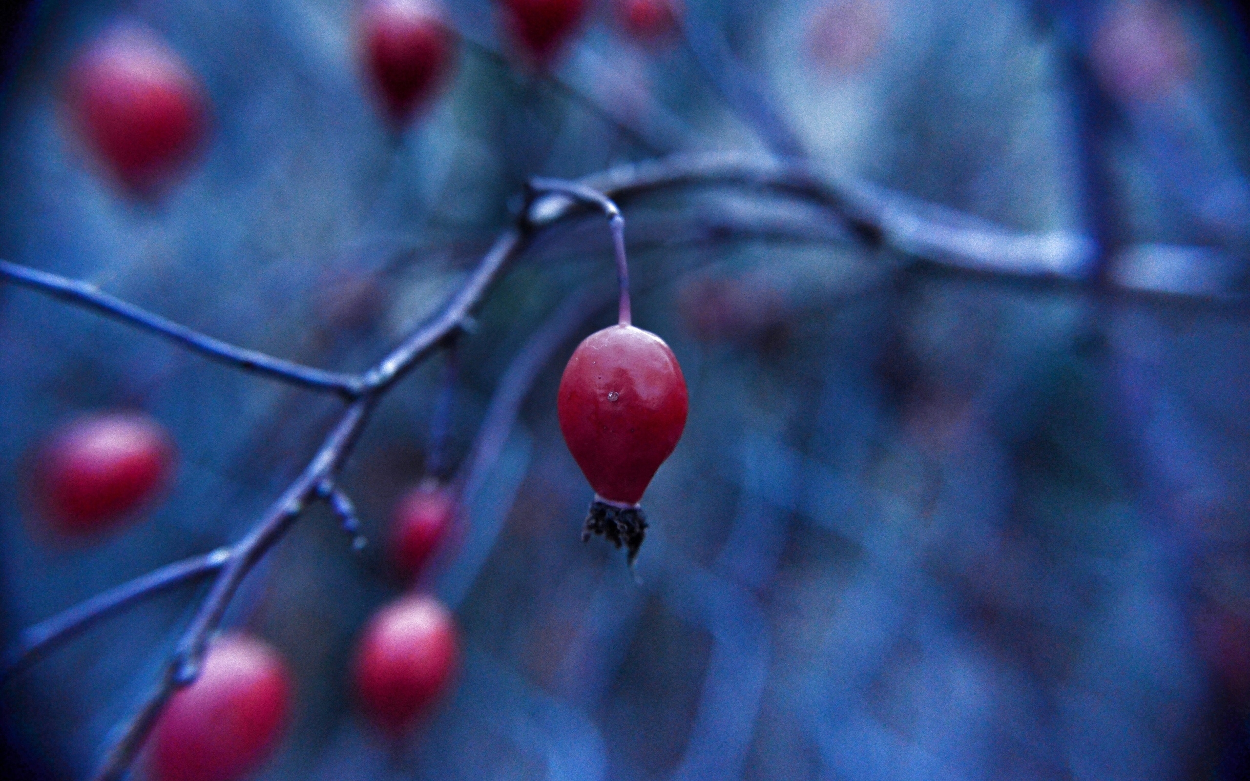 Description: A tree with red berries hanging from it's branches and a blurry background of trees and branches.