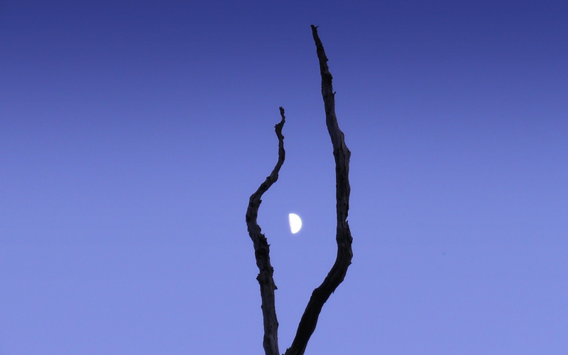 Description: A tree branch with a half moon in the background and a blue sky in the background with a few clouds.