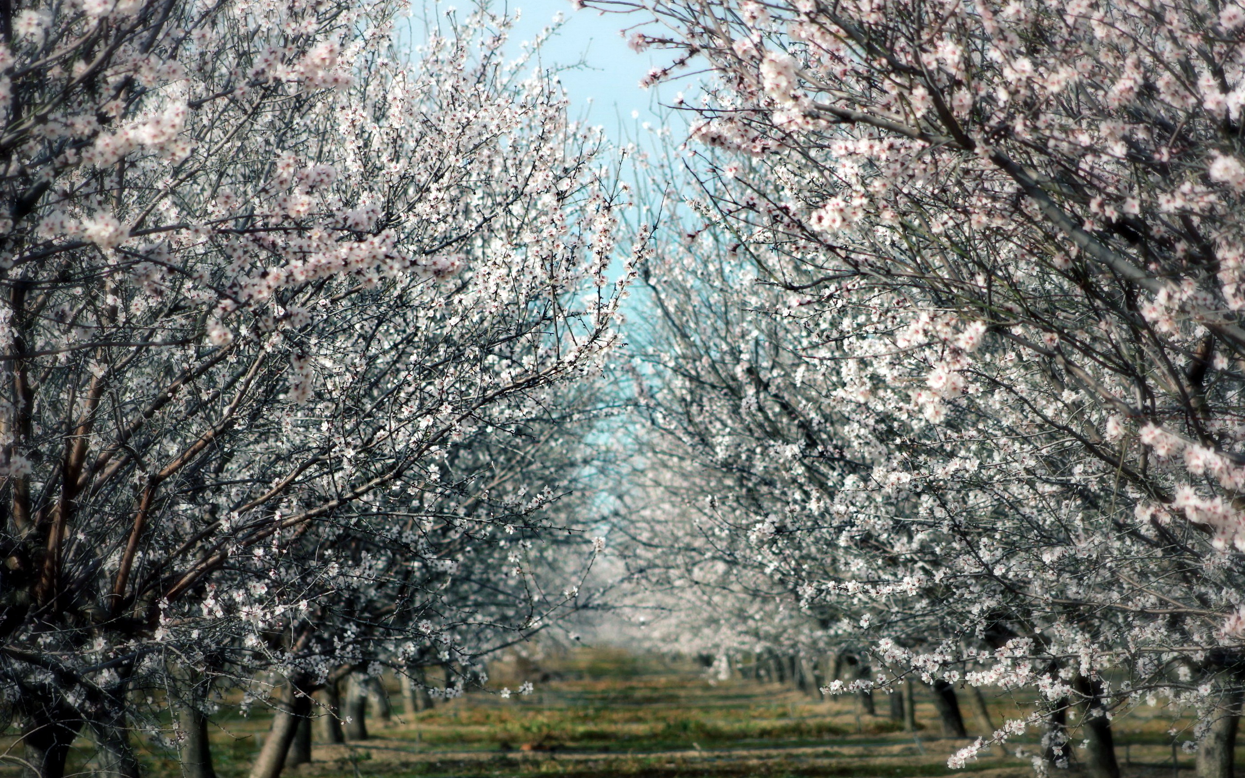 Description: A road lined with trees with white flowers on them and a blue sky in the background with a few clouds.