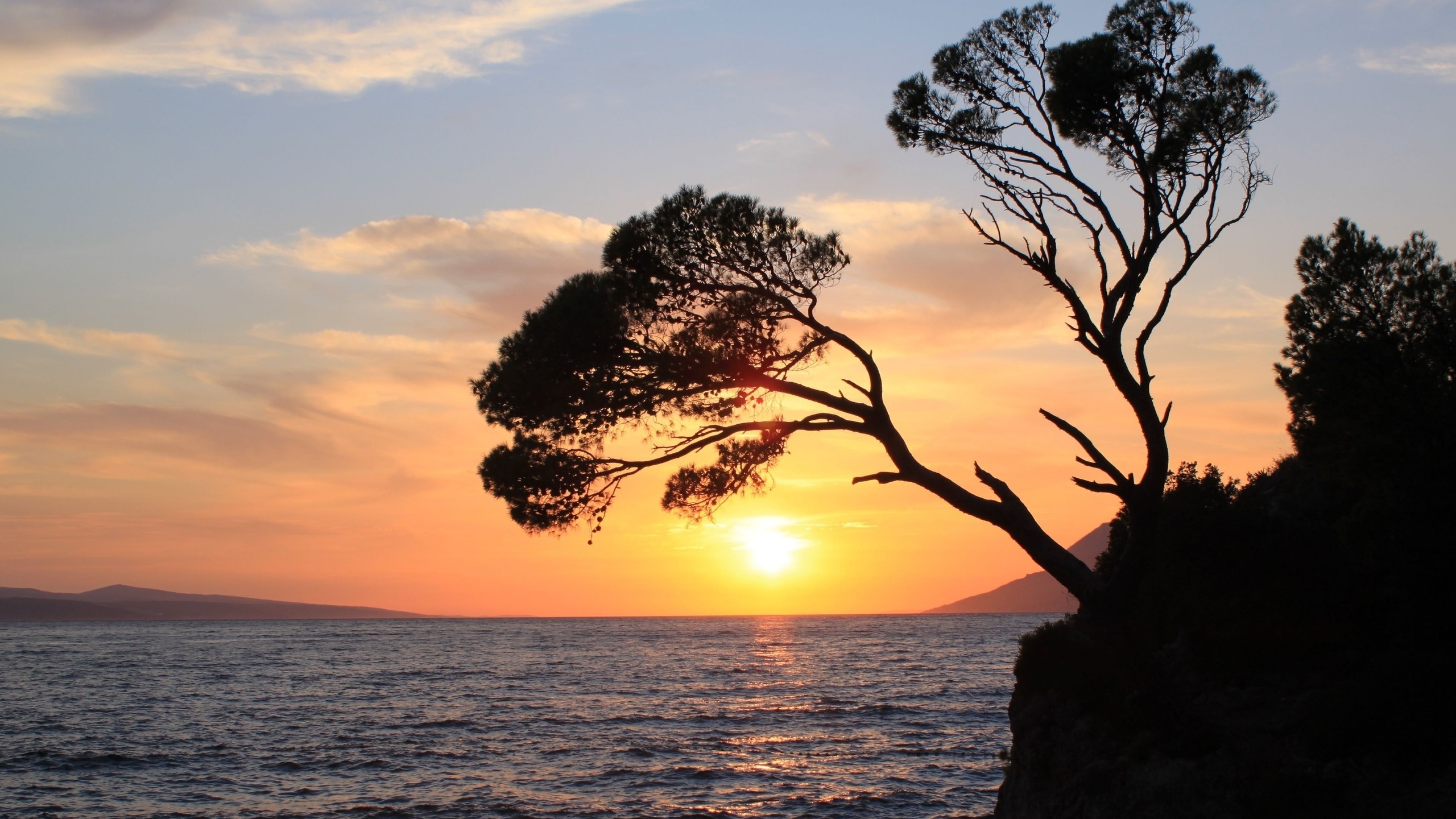 Description: A tree on a cliff overlooking the ocean at sunset or sunrise or sunset over the water with a boat in the distance.