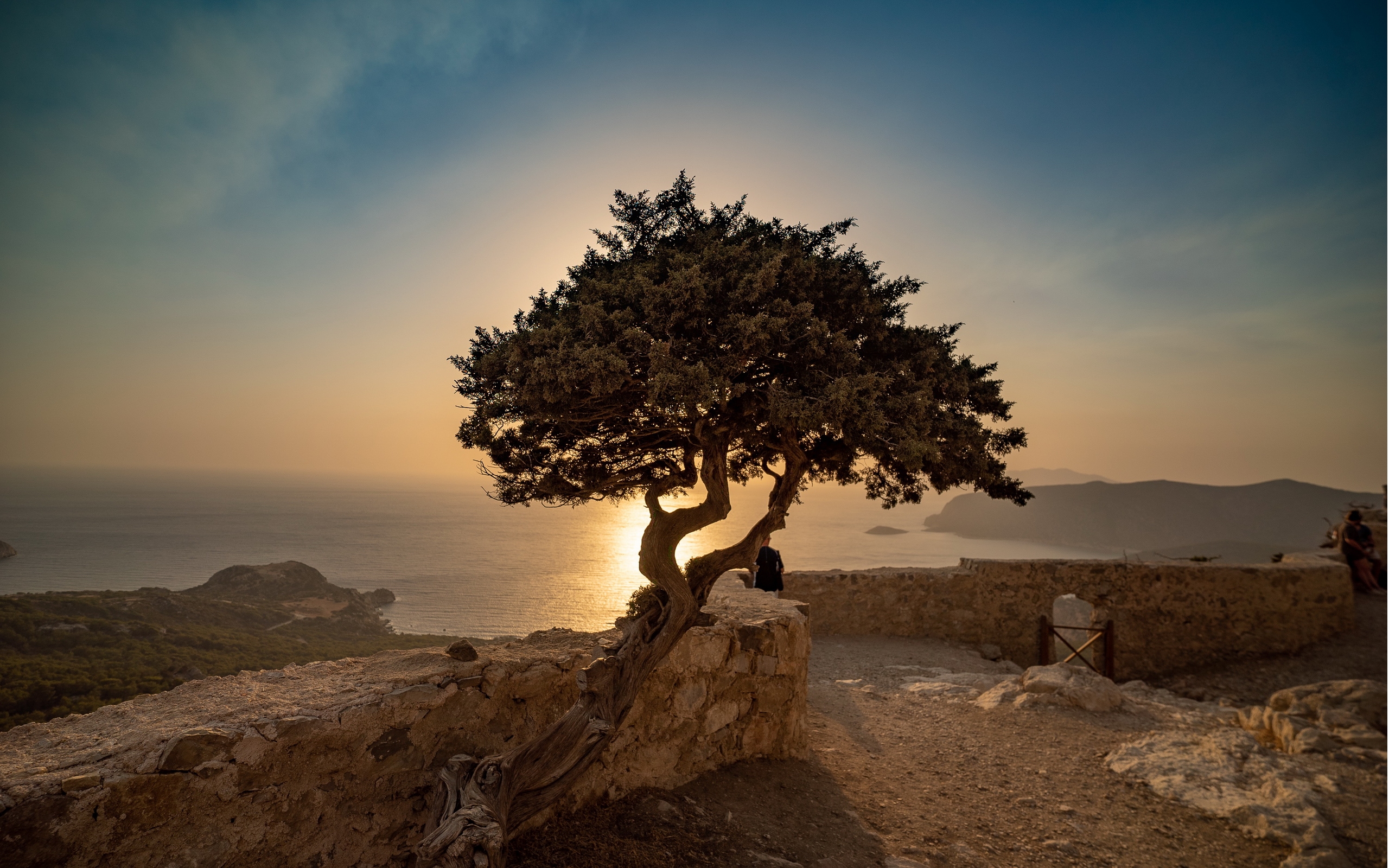 Description: A tree on a cliff with the sun setting in the background and a person sitting on a rock wall.