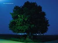 Description: A tree in a field with a full moon in the background and a blue sky with a few clouds.