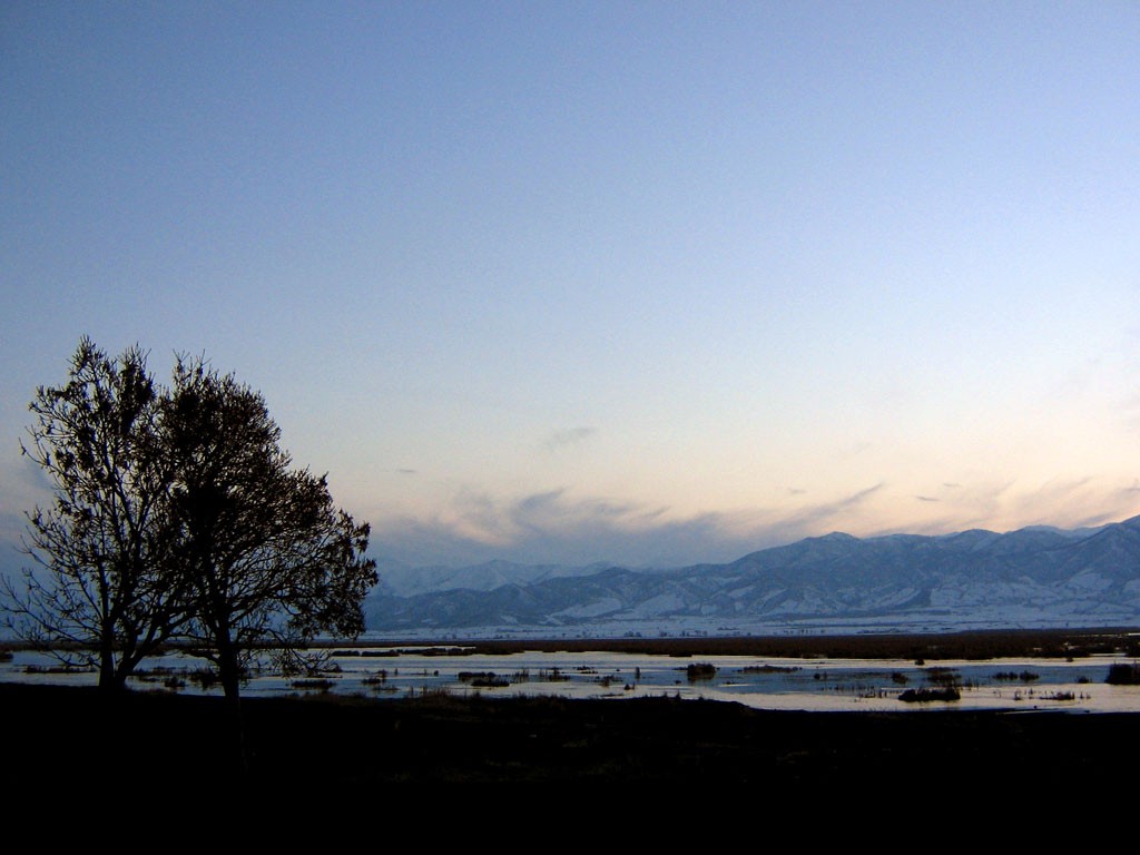 Description: A tree in a field with mountains in the background at dusk with a blue sky and some clouds in the distance.