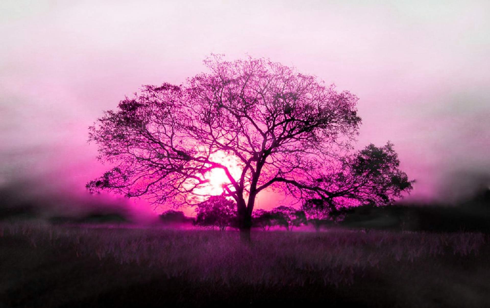 Description: A tree in a field with a pink sky in the background and a pink sun in the middle of the picture.