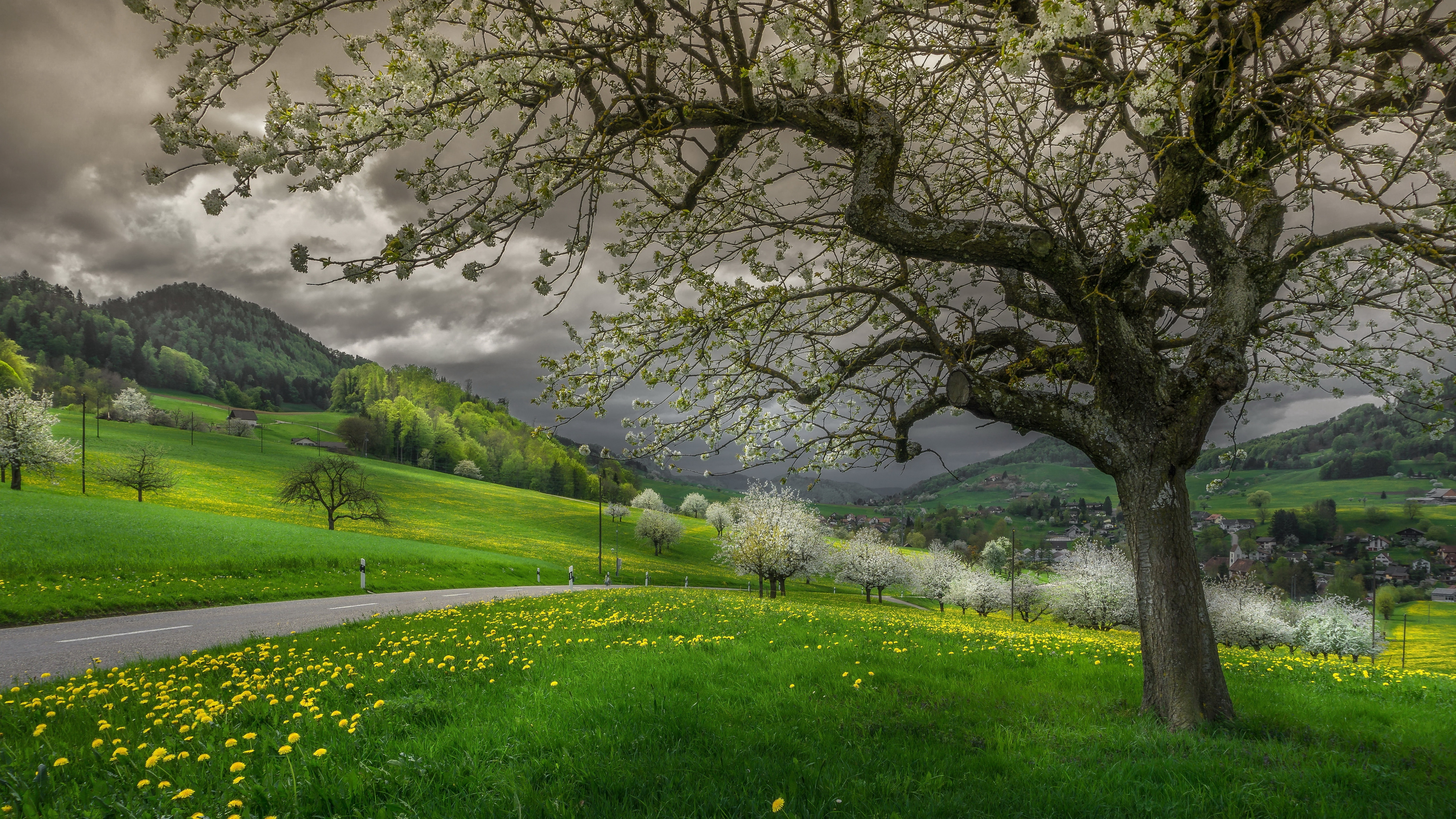 Description: A tree in a field with a road going by it and a cloudy sky above it and a green hillside.