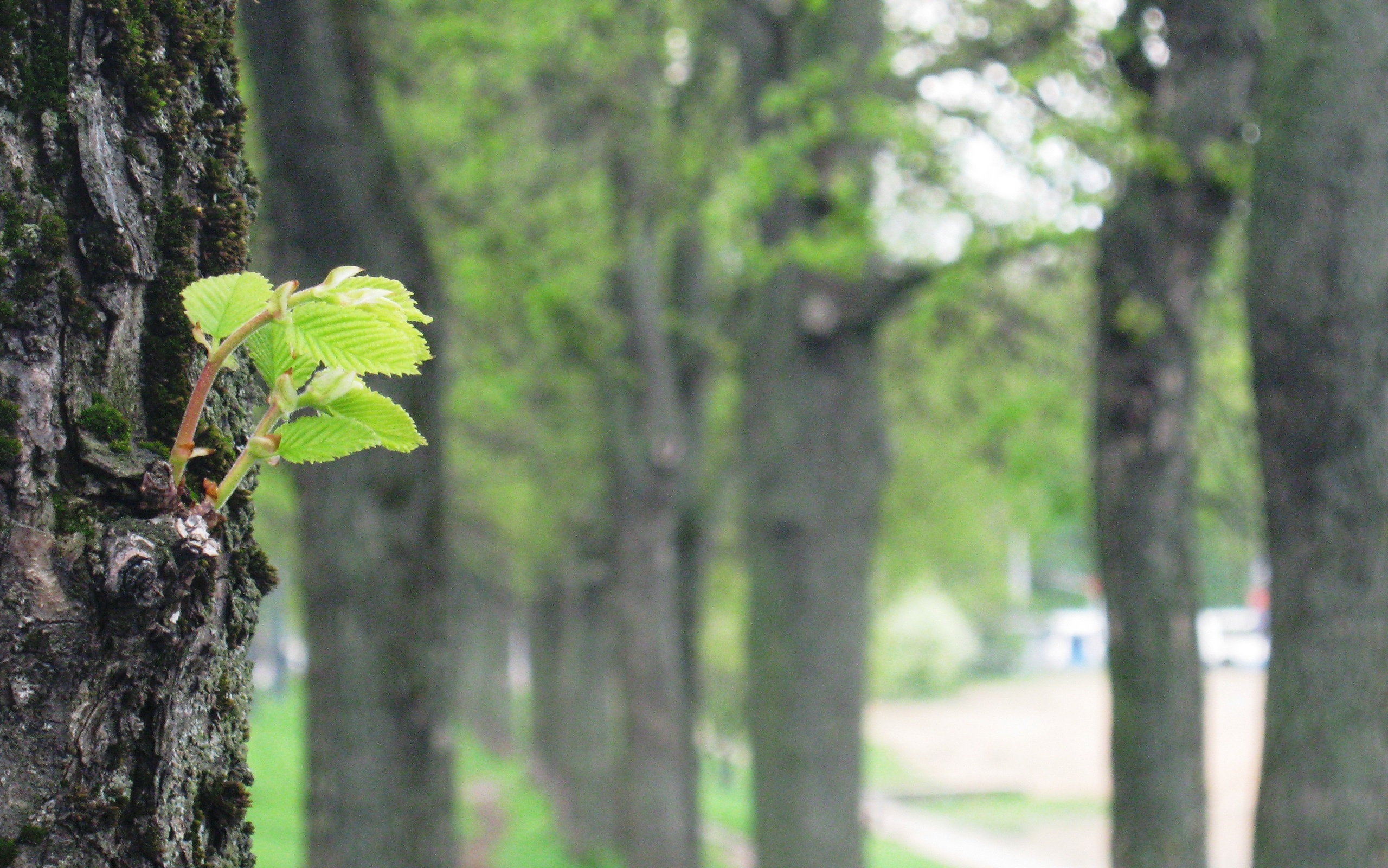 Description: A tree with a green leaf on it in a park area with a road in the background and a few trees.