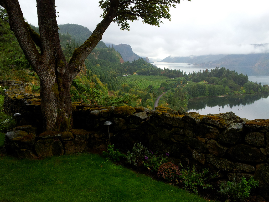 Description: A tree is standing next to a stone wall and a lake in the distance with a few clouds in the sky.