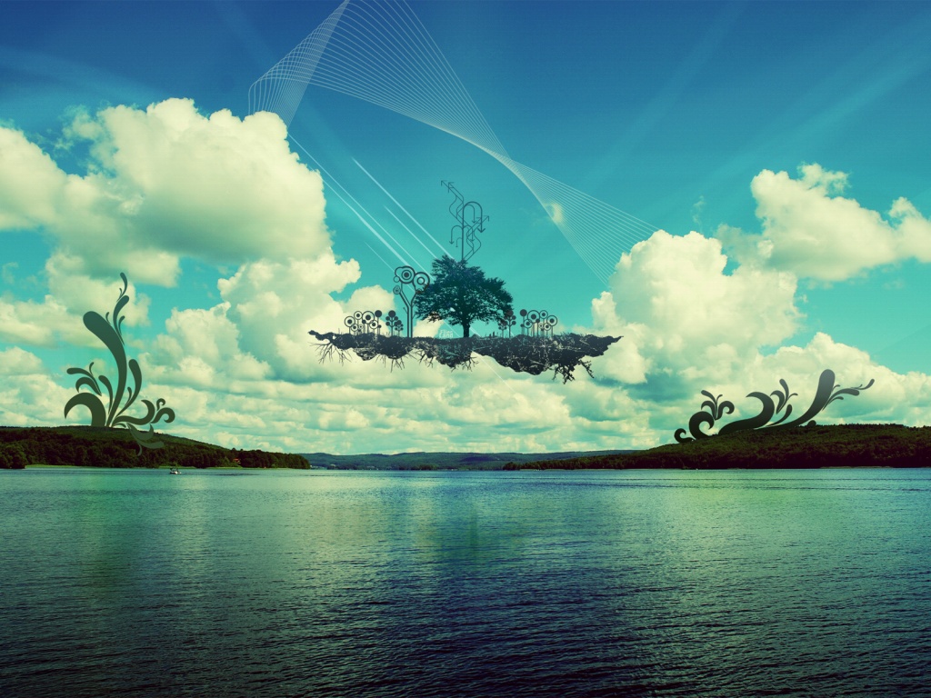 Description: A digital painting of a tree in the middle of a lake with a sky background and clouds in the background.