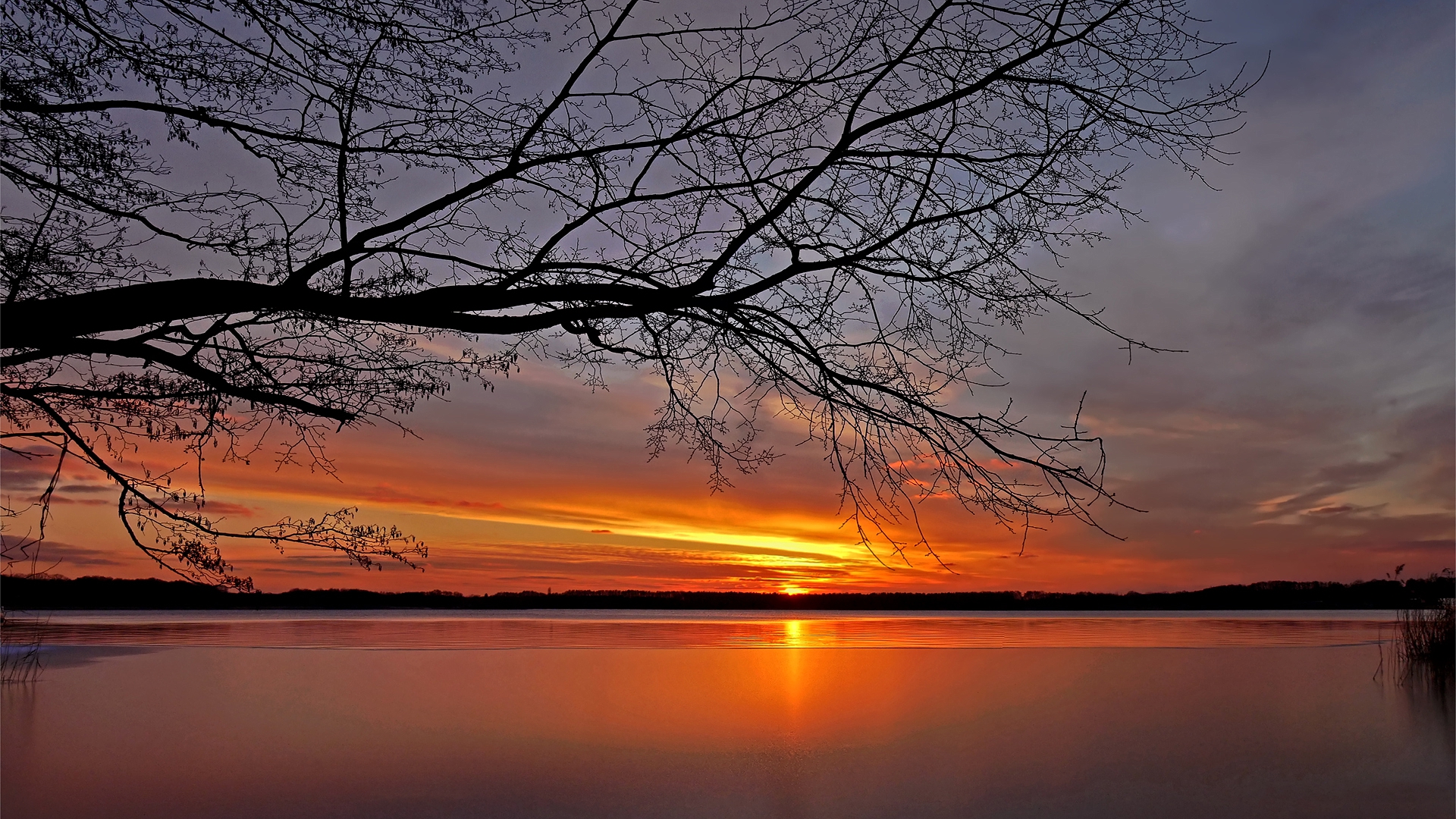 Description: A tree branch hanging over a lake at sunset or dawn with a setting sun in the distance and a few clouds.