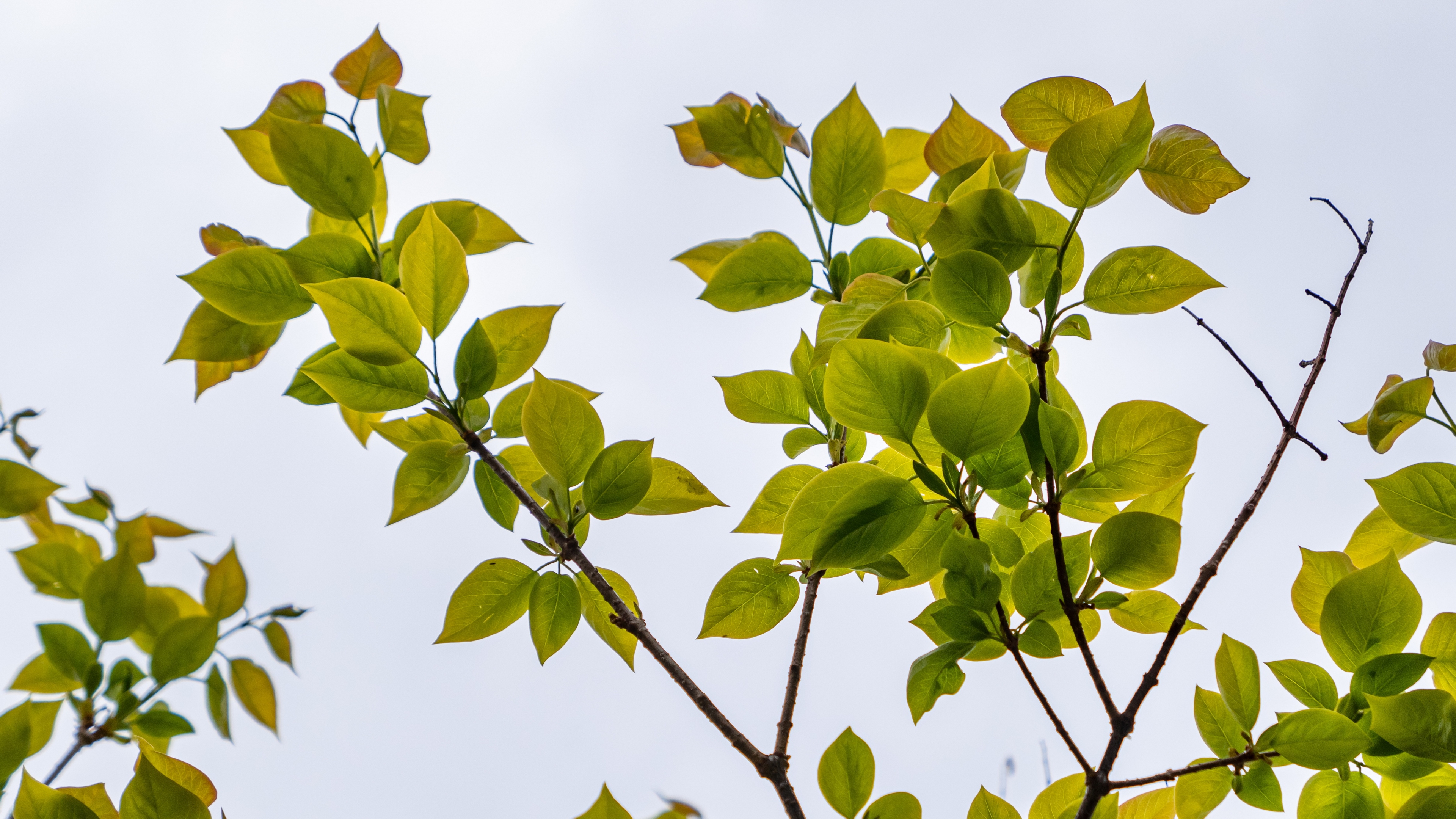 Description: A tree branch with green leaves against a blue sky background with a few clouds in the distance.