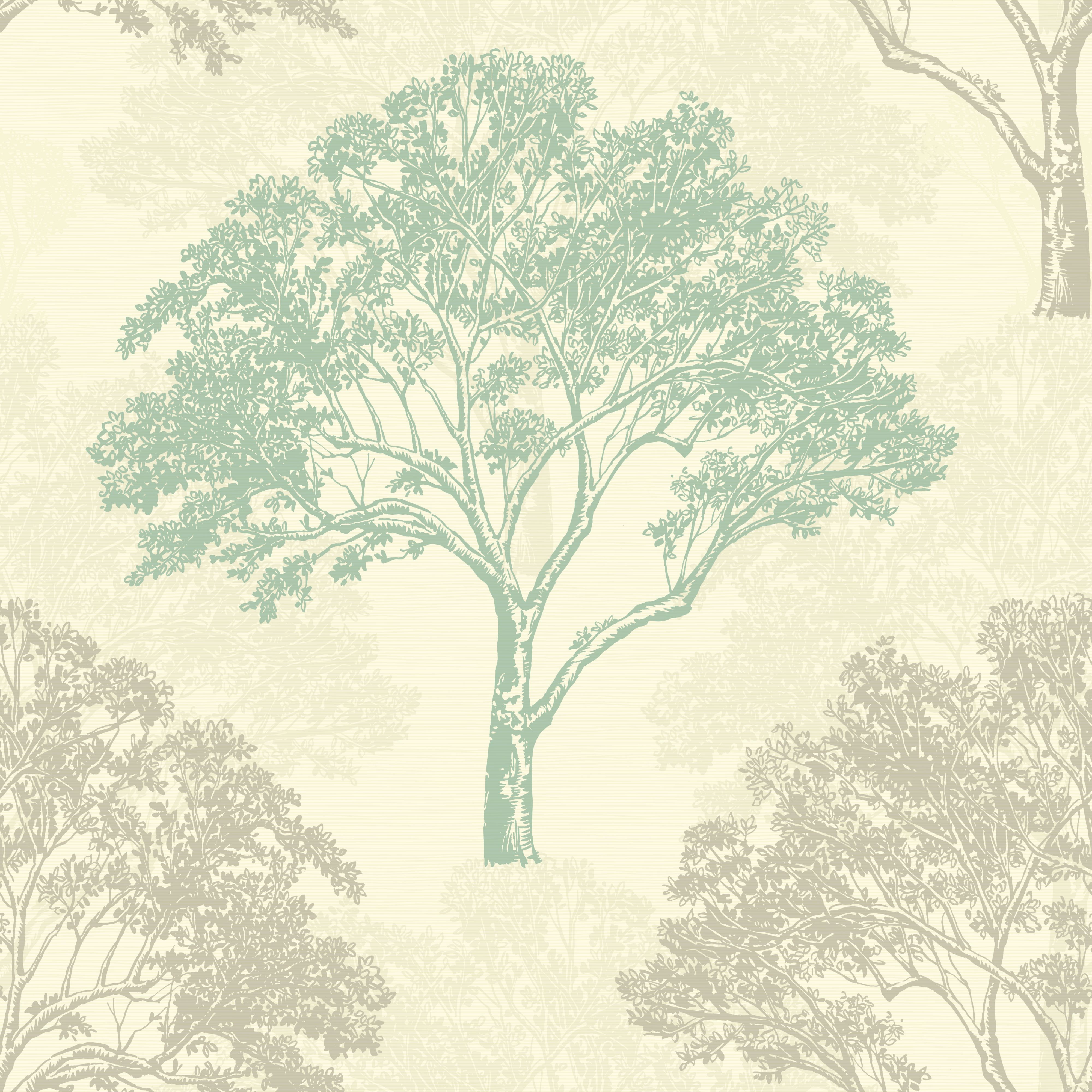 Description: A tree with many leaves on it in a forest wallpaper pattern with a light green background and a light green tree.