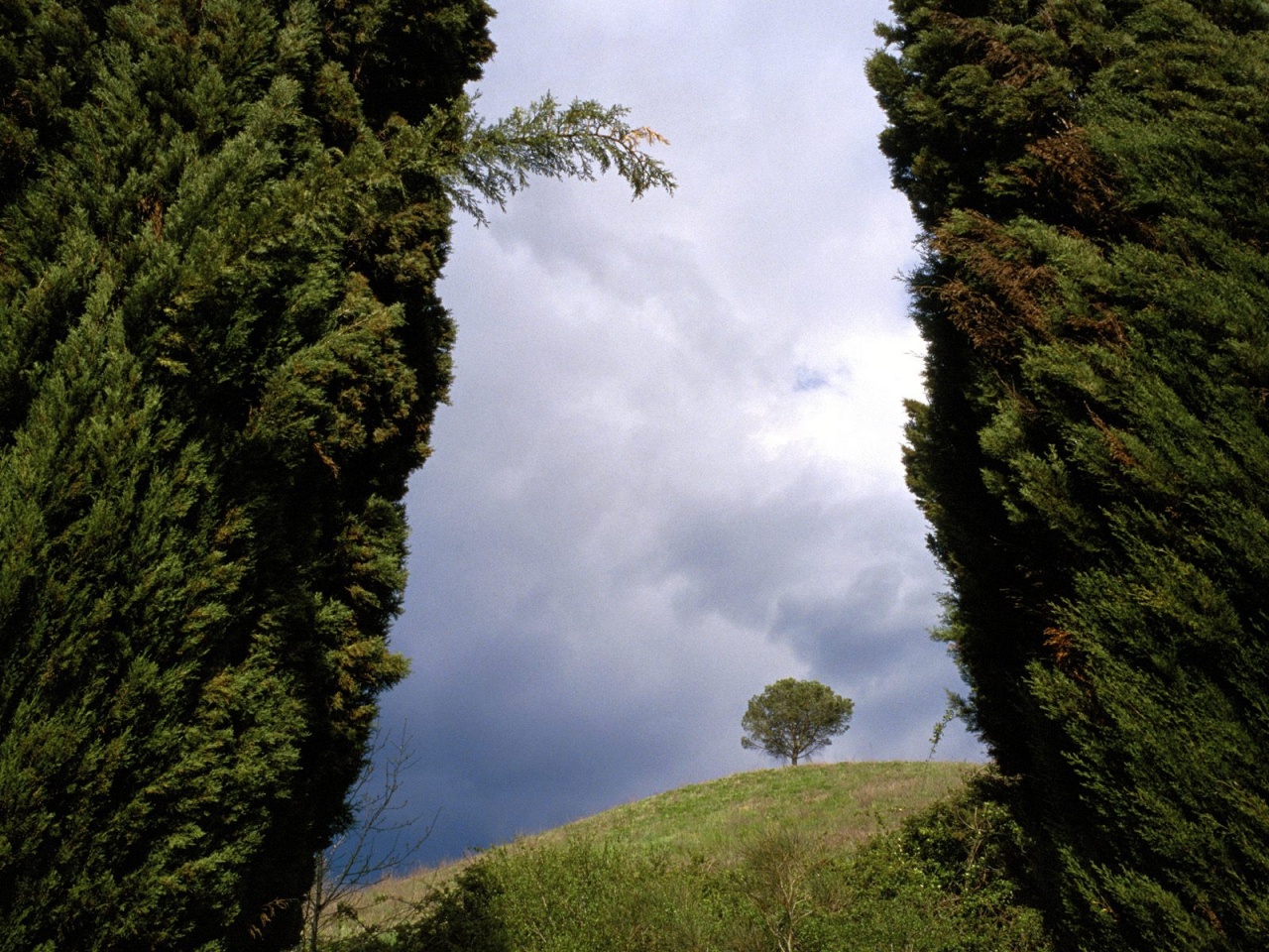 Description: A tree lined road with a lone tree in the distance and a cloudy sky above it.