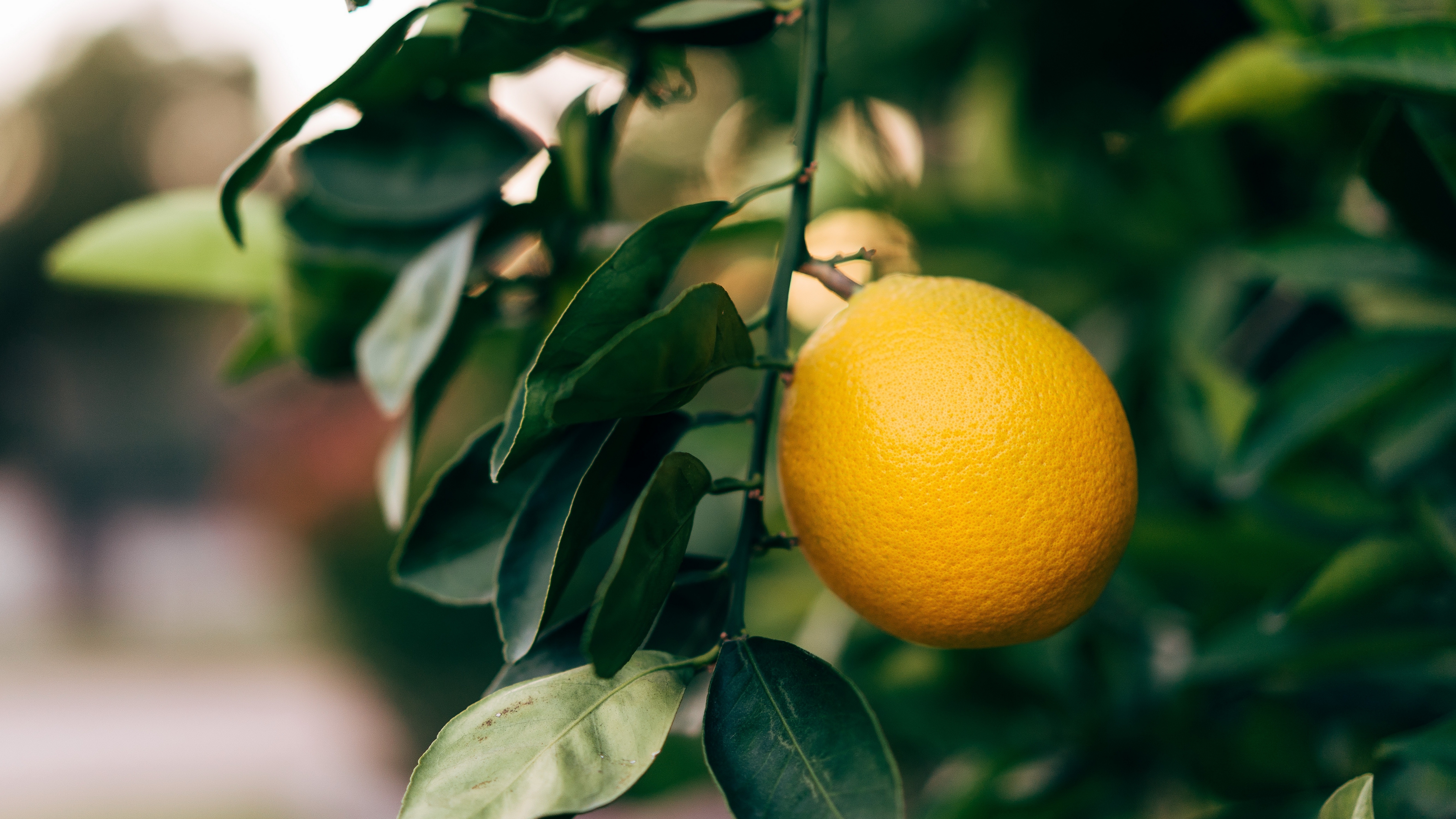 Description: A close up of a tree with a orange hanging from it's branches and leaves on it's branches.