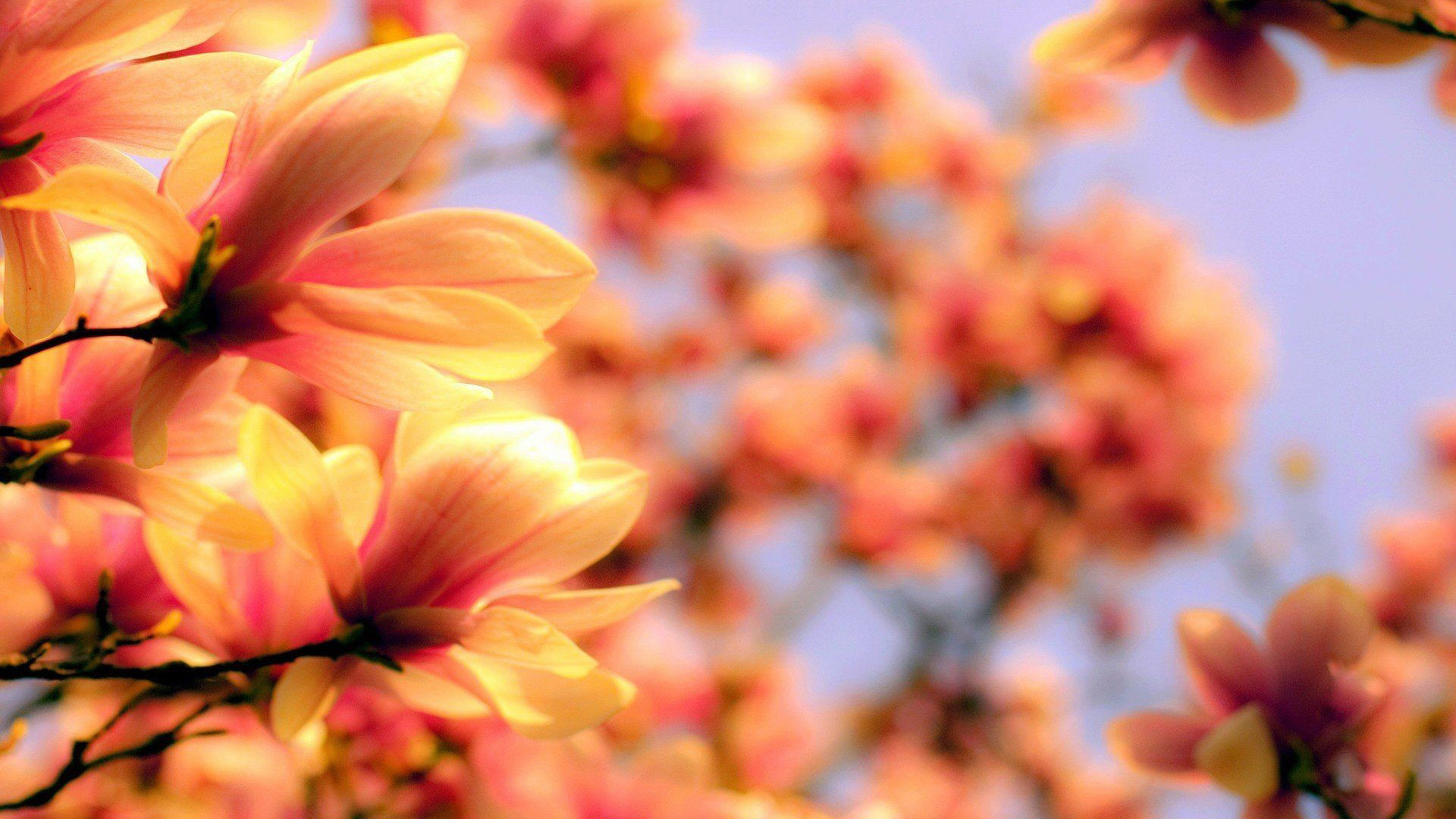 Description: A close up of a tree with pink flowers on it's branches and a blue sky in the background.
