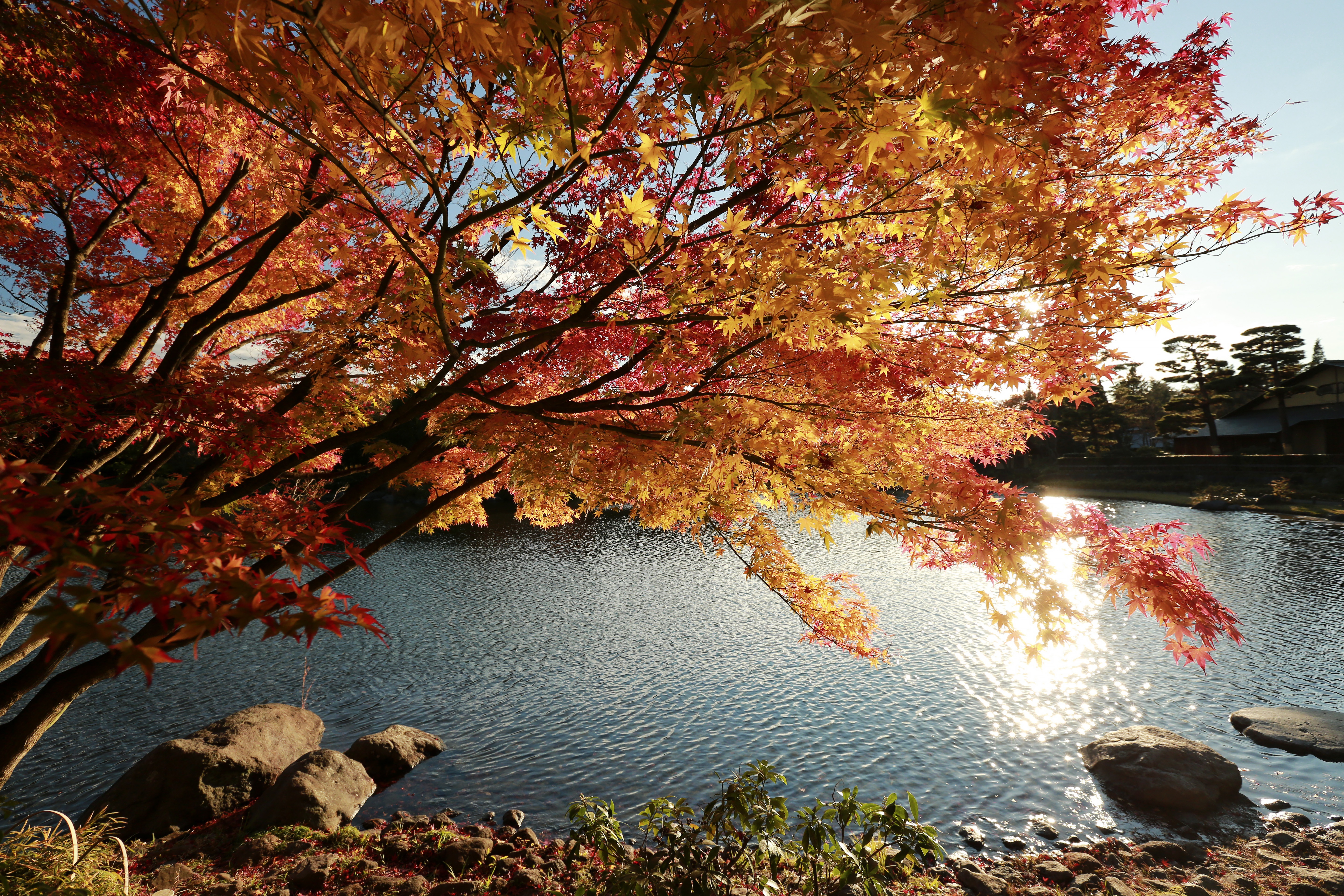 Description: A tree with red leaves is next to a body of water with rocks and a house in the background.