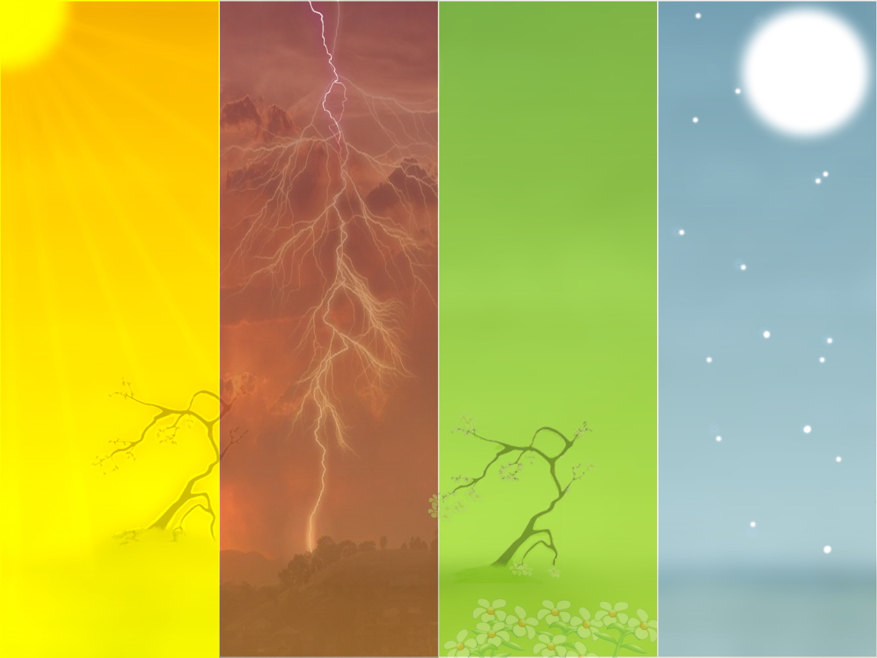 Description: A series of four different color images of a tree and a sky with a sun in the background and a few clouds.