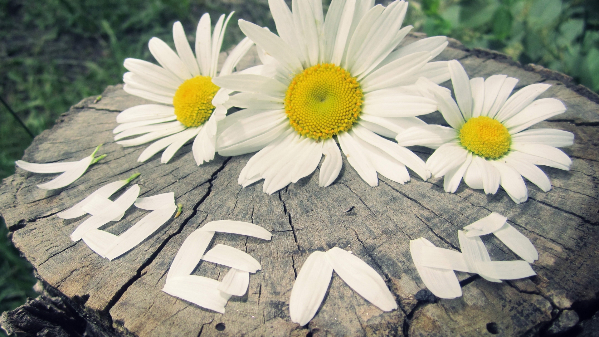 Description: A tree stump with flowers on top of it and the word begin written in white letters on it with yellow centers.