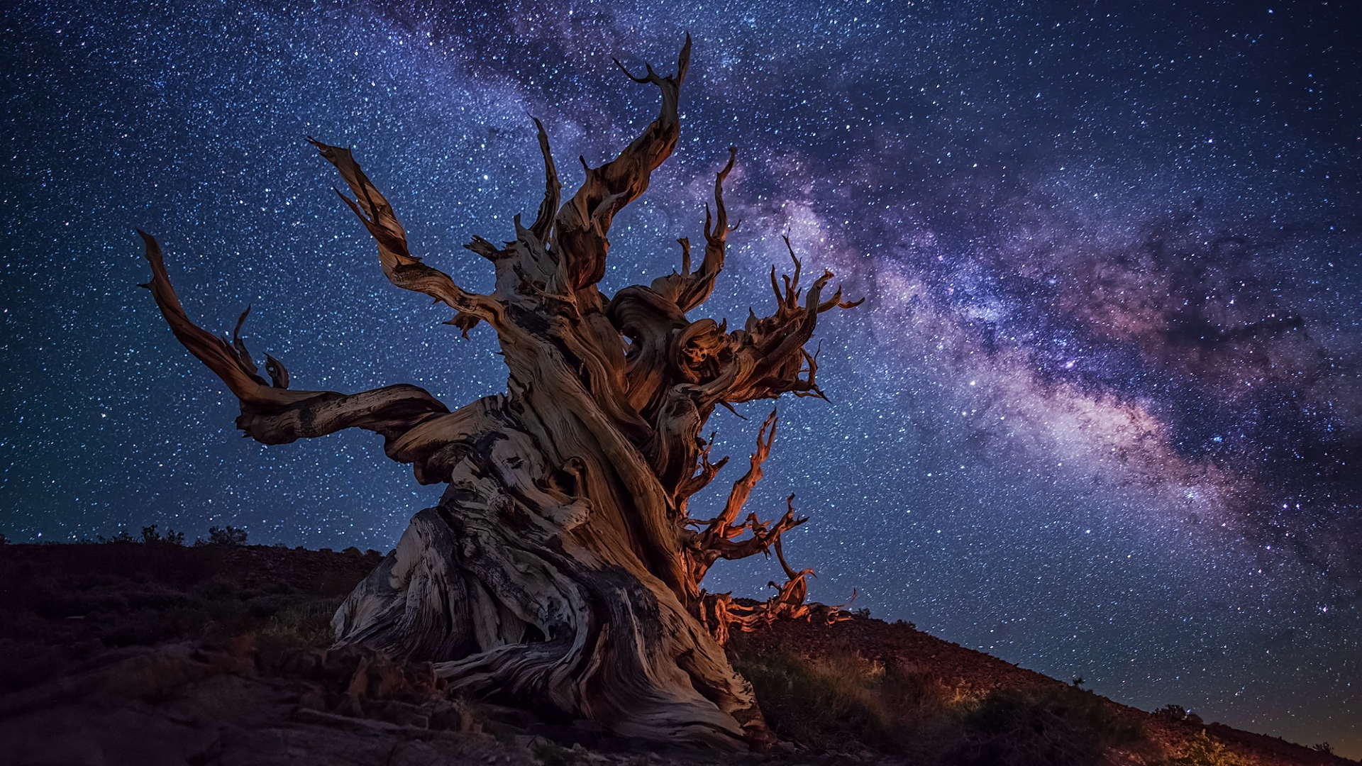Description: A tree stump with a star filled sky in the background and a star filled sky in the background.