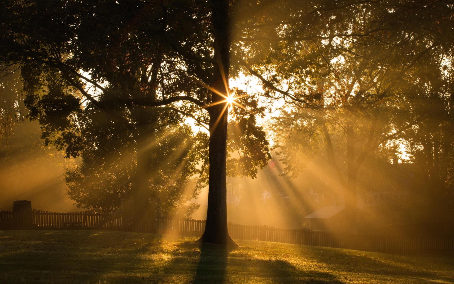 Description: A tree with the sun shining through the trees in the background and a fence in the foreground with a bench in the foreground.