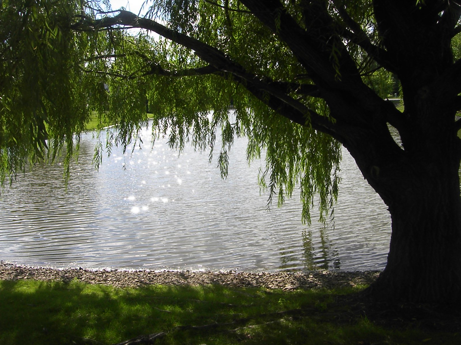 Description: A tree is next to a body of water with a bird in it and a bench under the tree.